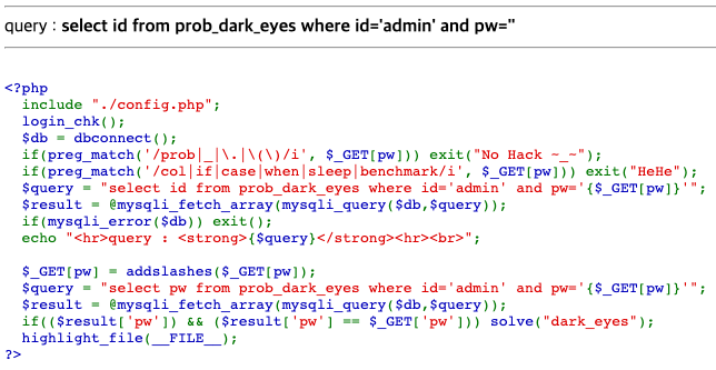 pw 파라미터의 검증은 prob, _, ., (), col, if, case, when, sleep, benchmark를 필터링하고 있으며, 두번째 쿼리에는 addslashes 함수를 사용하여 쿼리문에 넣어지고 있다.