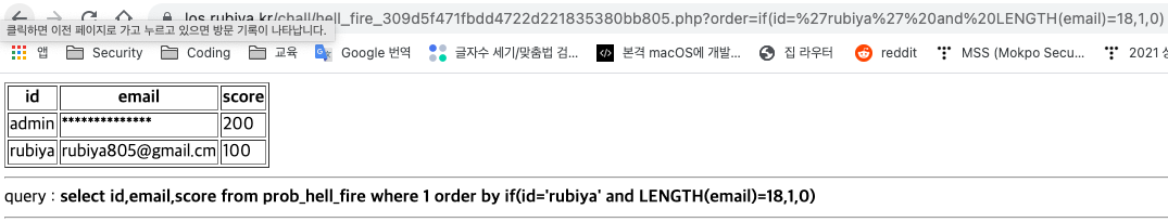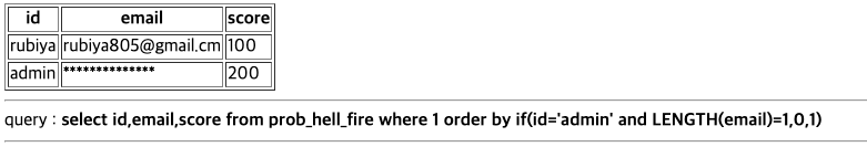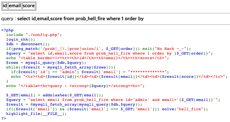 첫번째 쿼리문은 select id,email,score from prob_hell_fire where 1 order by {$_GET[order]}로 order by를 이용하여 정렬을 시켜서 반환 값을 표로 출력한다.