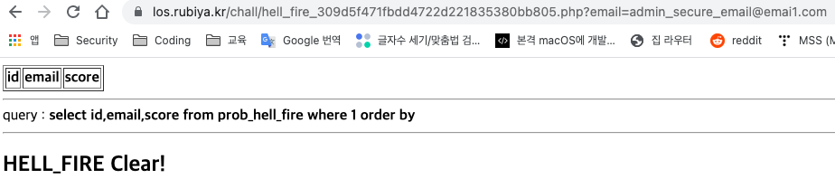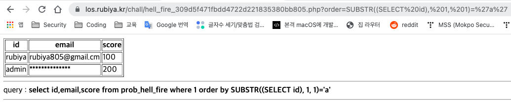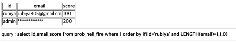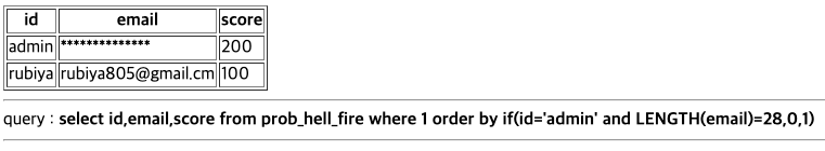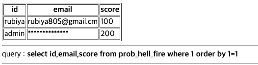 첫번째 쿼리문은 select id,email,score from prob_hell_fire where 1 order by {$_GET[order]}로 order by를 이용하여 정렬을 시켜서 반환 값을 표로 출력한다.