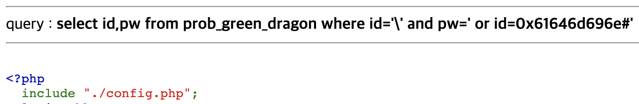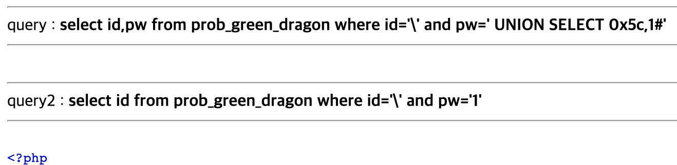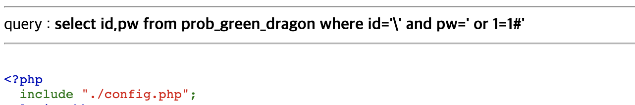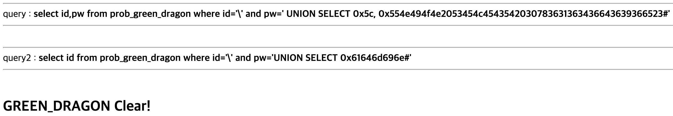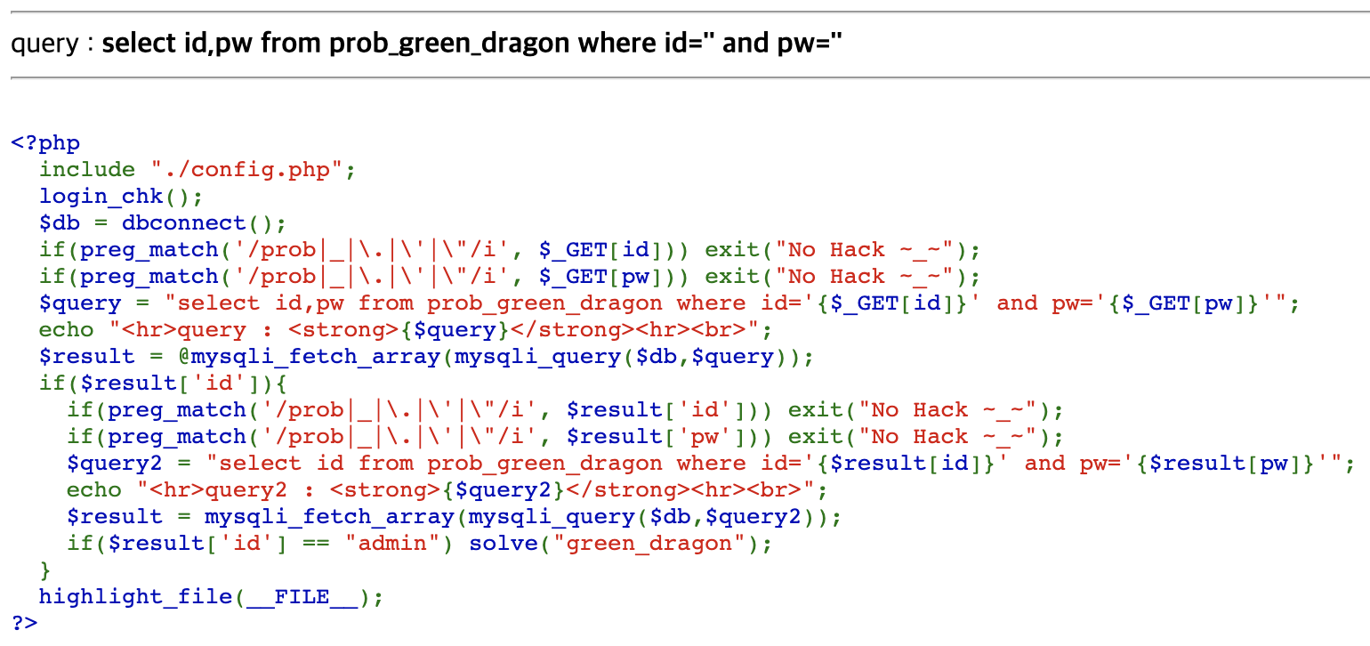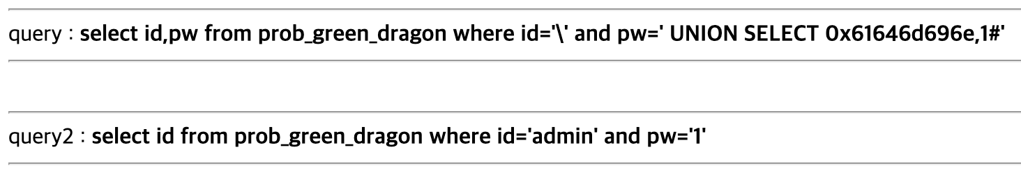 공격 백터는 id와 pw가 있으며, select id,pw from prob_green_dragon where id='{$_GET[id]}' and pw='{$_GET[pw]}'에 사용이 된다. 똑같은 쿼리문이 2개가 작동하는데 첫번째 쿼리문의 id 결과 값이 있어야만 두번째 쿼리문이 작동되는 시스템이다.