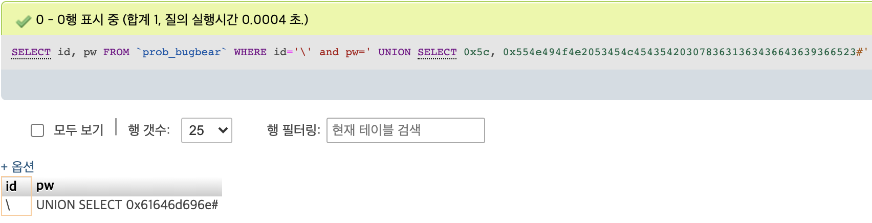 두번째 쿼리문의 where절 pw에 들어가야하는 값은 UNION SELECT 0x61646d696e#이 들어가면 될 것 같았다. 하지만 첫번째 쿼리문에서 이를 인식하여 이상한 쿼리문이 만들어졌다.