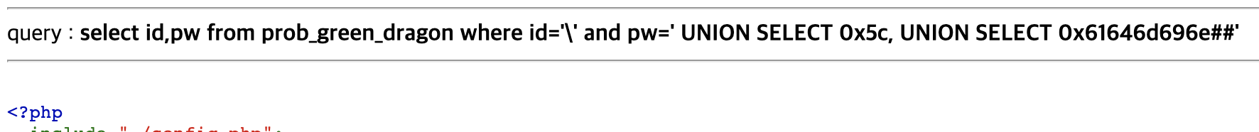 ?id=&pw= UNION SELECT 0x5c, UNION SELECT 0x61646d696e#