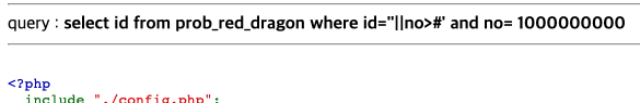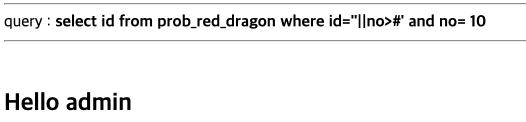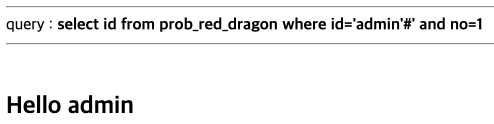$query = "select no from prob_red_dragon where id='admin'"; // if you think challenge got wrong, look column name again.
