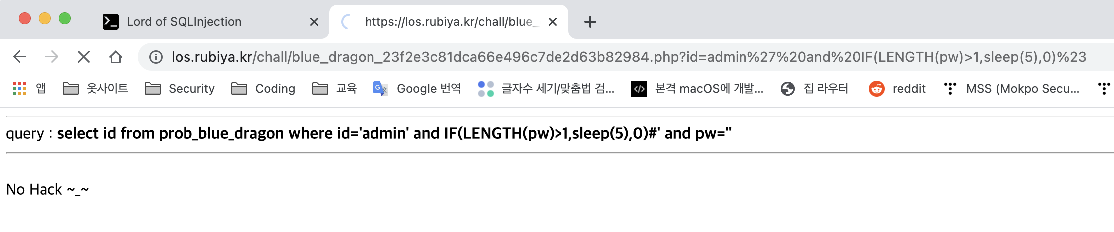 나는 첫번째 쿼리문을 select id from prob_blue_dragon where id='\' and pw=' or id=~~~#'