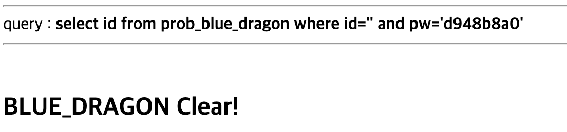 if(($result['pw']) && ($result['pw'] == $_GET['pw'])) solve("blue_dragon");