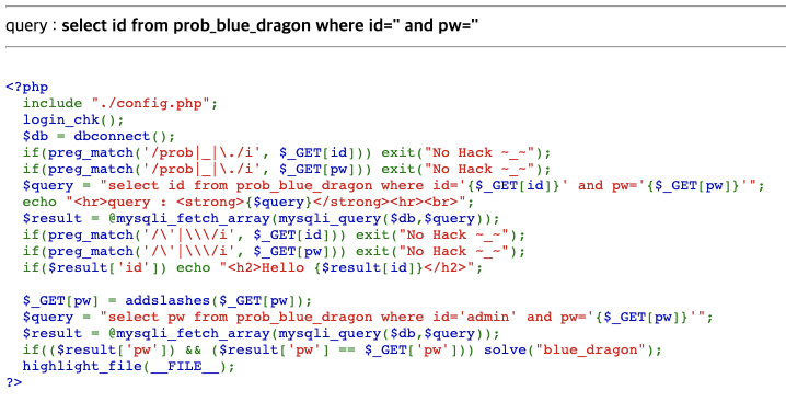 $query = "select id from prob_blue_dragon where id='{$_GET[id]}' and pw='{$_GET[pw]}'";