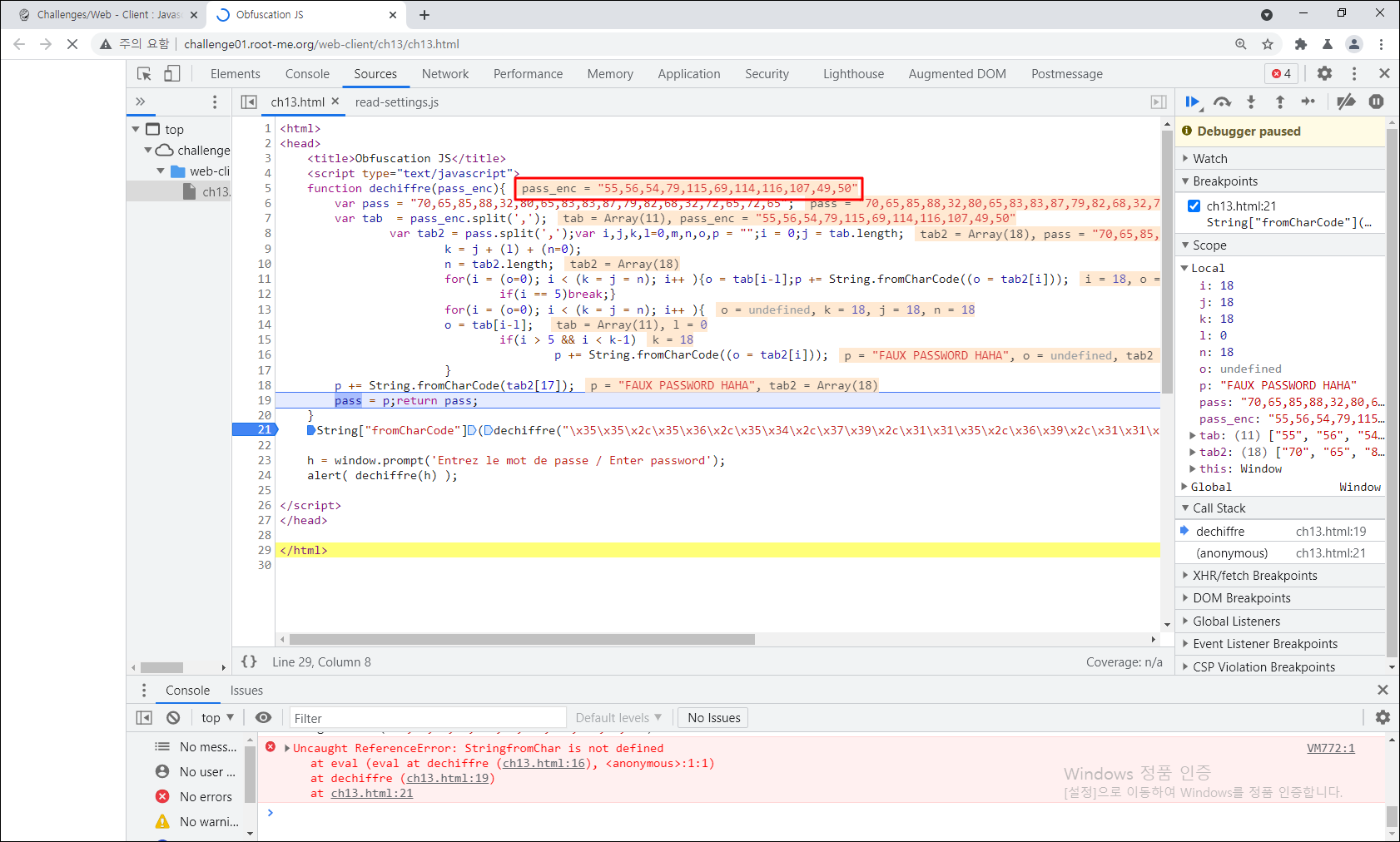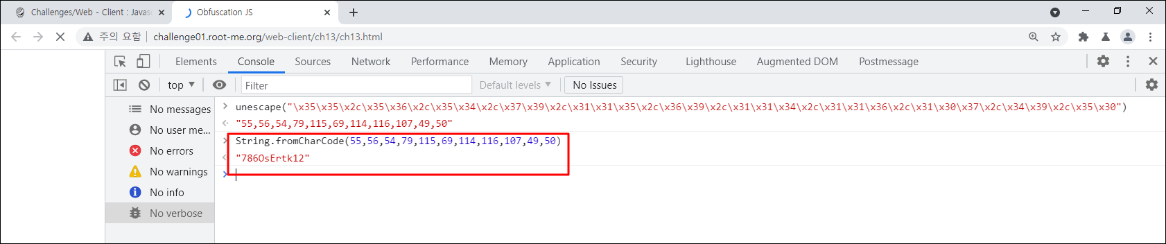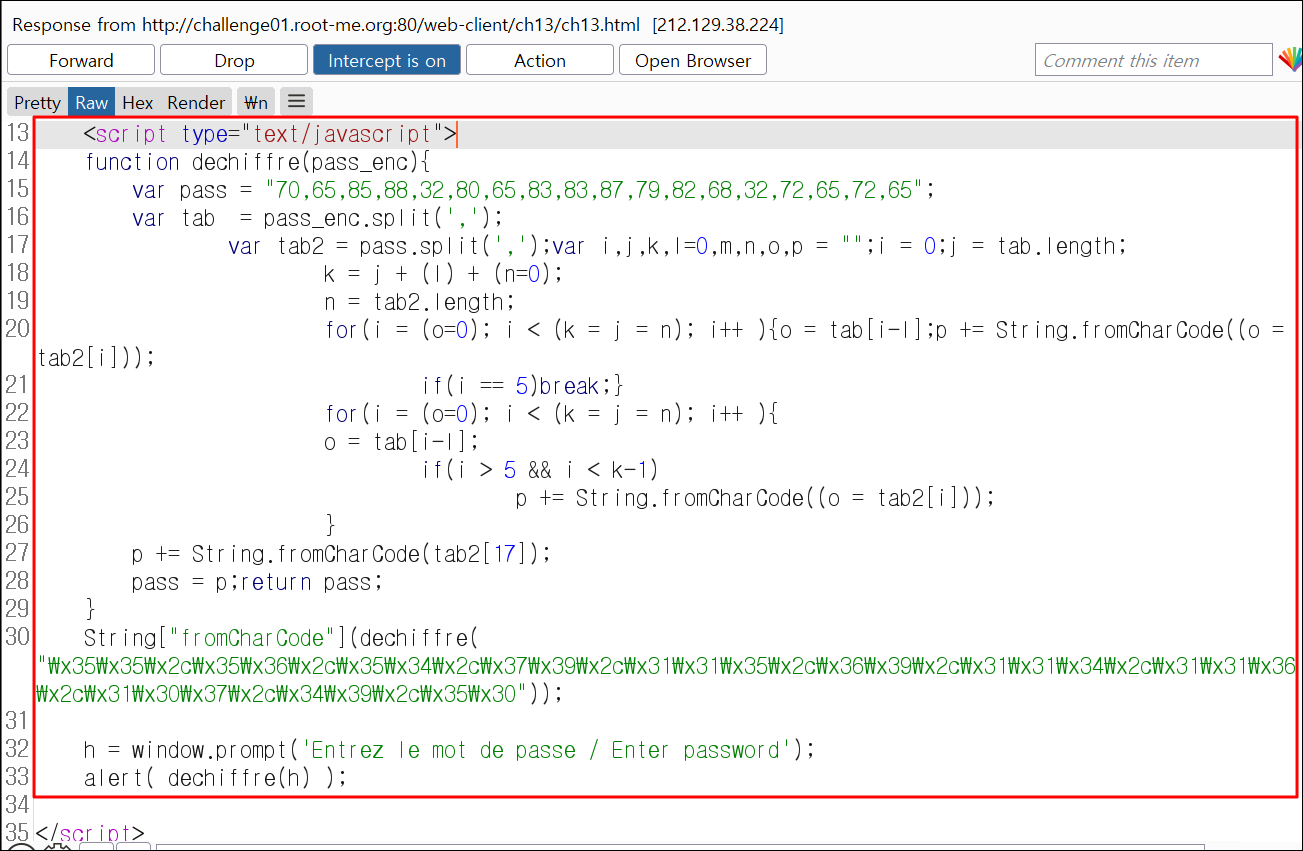 Season 1/워게임 [Root-Me]/Web Client/Javascript - Obfuscation 3 작성자 - 한수임 클라이언트 Obfuscation 3문제 풀이 시작해보도록 하겠습니다. 위에 두 문제 정도는 시간이 좀 걸릴 것 같아 다음에 풀이법을 작성하여 보겠습니다~ 1. 문제 이번에도 동일하게 패스워드를 푸는 문제가 되겠네요~ 2. 문제풀이 처음 문제에 접속하게 되면 패스워드 입력하는 곳이 등장하여, test라는 임의의 문자를 입력하여보았습니다. 확인 버튼을 누르니 잘못된 패스워드라며 비웃어버립니다. 우선 힌트를 보기 위해 요청 패킷을 잡아보았습니다. 패킷의 pass를 보면 숫자가 뜬금없이 존재하며, ASCII코드의 숫자 값과 관련이 있지 않겠나 라는 추측을 해 보았습니다. 이후 숫자를 ASCII코드의 숫자와 대조해 보니 FAUX PASSWORD HAHA라는 값이 나오게 되었습니다. 코드를 분석하여 결과값을 토대로 힌트를 얻어보려 했지만, 계산하기가 쉽지 않아 개발자 모드의 디버깅 모드를 사용해보기로 결정하였습니다. String["fromCharCode"] 부분을 보면 hex(16진수) 값을 통해 ASCII코드가 나타나 있는 것이 보이며, 이것을 콘솔 명령어를 통해 간단히 확인해 보겠습니다. unescape를 통해 16진수를 10진수의 ASCII 코드로 나타내 보았습니다. 이후 10진수의 ASCII 코드를 풀어보니 7860sErtk12 값이 나오게 되었고 이 값을 패스워드에 입력해 보았습니다. 결과는.... 문제에서는 답을 도출하는 로직이 존재하지 않아 입력하여도 alert를 통해 FAUX PASSWORD HAHA문구를 띄우게 되어있습니다. 이번 문제를 통해서도 많은 걸 배우게 된 것 같다. 앞으로도 개발자 도구 모드를 잘 사용해 보아야겠다~ 문제풀이 끄읏~ 공유하기 게시글 관리 MSS 'Season 1 > 워게임' 카테고리의 다른 글 [websec.fr] easy - Level 11 (0) 2021.08.22 [HackCTF] Web - Auth3ntication 풀이 (0) 2021.08.21 [Lord of SQLInjection] Blue Dragon Write UP (0) 2021.08.19 [Lord of SQLInjection] Red Dragon Write UP (0) 2021.08.18 [HackCTF] Web - LOL 풀이 (0) 2021.08.15 Contents 당신이 좋아할만한 콘텐츠 [websec.fr] easy - Level 11 2021.08.22 [HackCTF] Web - Auth3ntication 풀이 2021.08.21 [Lord of SQLInjection] Blue Dragon Write UP 2021.08.19 [Lord of SQLInjection] Red Dragon Write UP 2021.08.18 댓글 0 + 이전 댓글 더보기