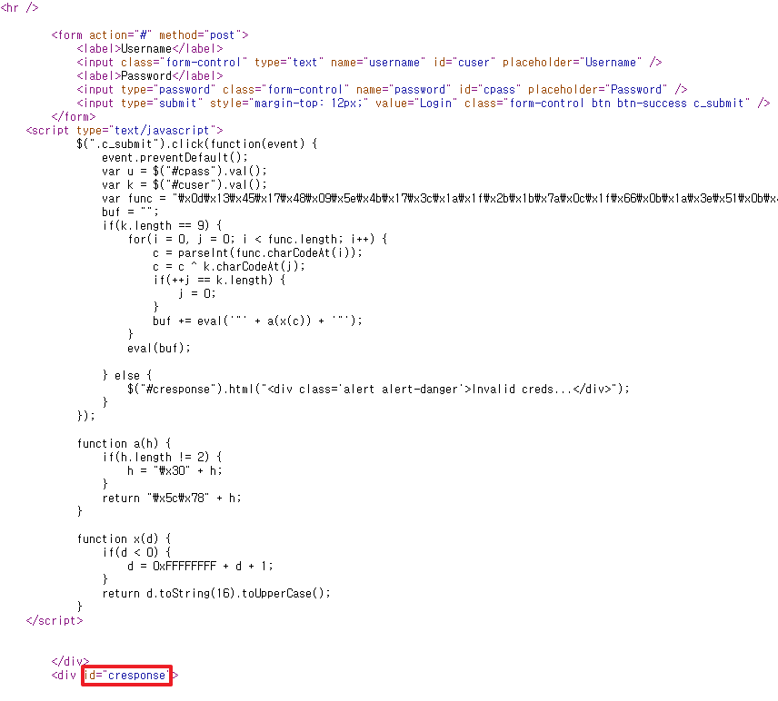 Season 1/워게임 [HackCTF] Web - Auth3ntication 풀이 작성자 - 호롤로롤 처음에 Username과 Password를 통해서 인증을 받아 flag값을 추출하는 문제인줄 알고 인젝션을 시도해보았는데 되질 않았다,,, 소스보기를 통해서 봐보자,,, 소스에 별다른 힌트는 없는듯 보이고 맨 아래 부분에 cresponse라는 id 값이 보인다. 이 id 값을 넣으면 flag 값을 얻을 수 있는건가? 바로 확인해보자. cresponse라는 값을 넣어보니 사진과 같이 나왔는데 의심스러운 문자열이 보인다 'dumbh4ck5' 이 값도 한번 넣어보자. 사진과 같은 값이 나왔다. 한번 id에 dumbh4ck5, password에 XorIsNotSooS3cur3를 넣어보자. 그렇게 되면 flag 값을 구할 수 있었다... 생각보다 간단하게 타고 들어가면 풀리는 문제였다. 쩝. 공유하기 게시글 관리 MSS 'Season 1 > 워게임' 카테고리의 다른 글 [Root-Me]/Web Server/HTTP - Open redirect (0) 2021.08.23 [websec.fr] easy - Level 11 (0) 2021.08.22 [Root-Me]/Web Client/Javascript - Obfuscation 3 (0) 2021.08.19 [Lord of SQLInjection] Blue Dragon Write UP (0) 2021.08.19 [Lord of SQLInjection] Red Dragon Write UP (0) 2021.08.18 Contents 당신이 좋아할만한 콘텐츠 [Root-Me]/Web Server/HTTP - Open redirect 2021.08.23 [websec.fr] easy - Level 11 2021.08.22 [Root-Me]/Web Client/Javascript - Obfuscation 3 2021.08.19 [Lord of SQLInjection] Blue Dragon Write UP 2021.08.19 댓글 0 + 이전 댓글 더보기
