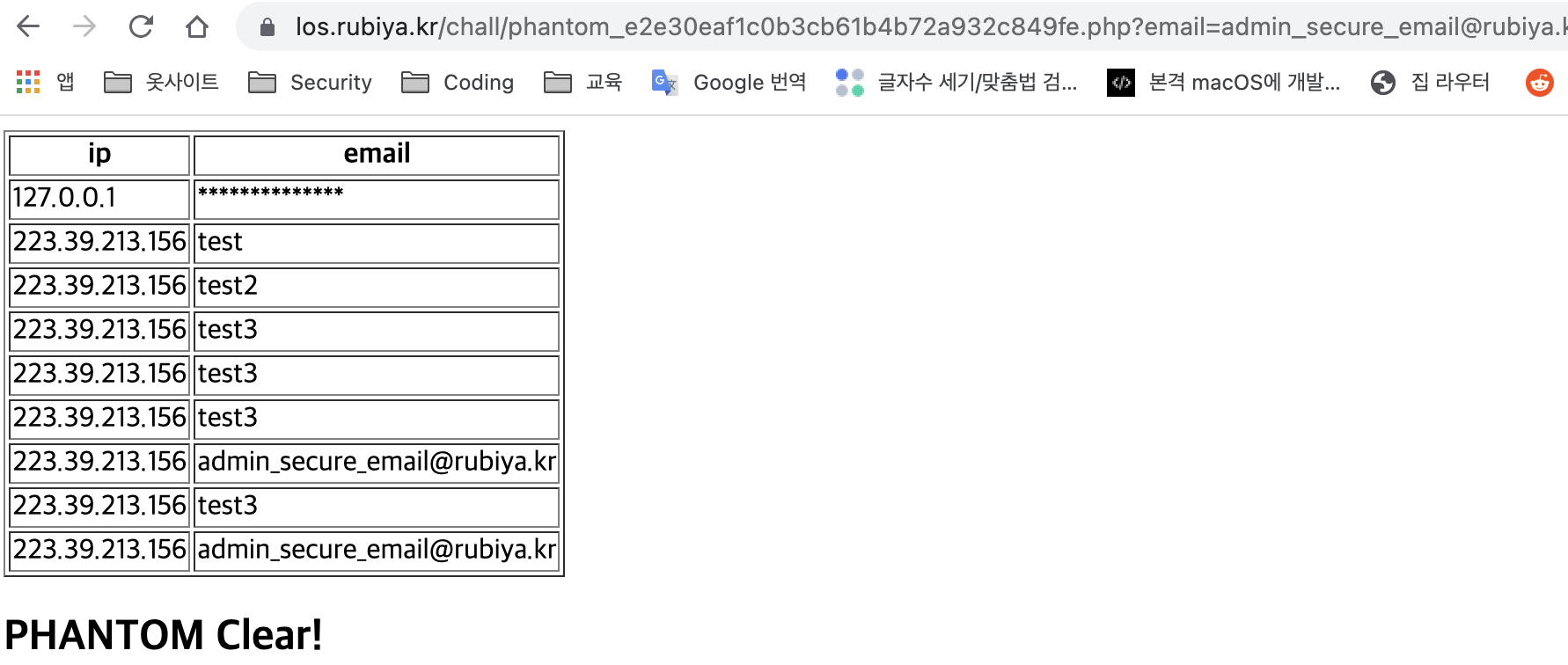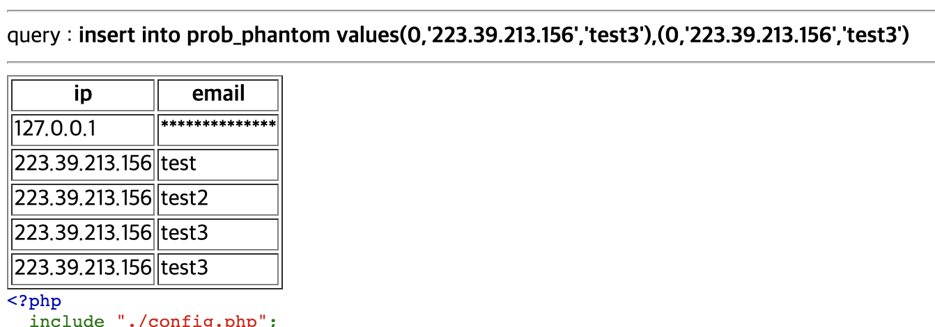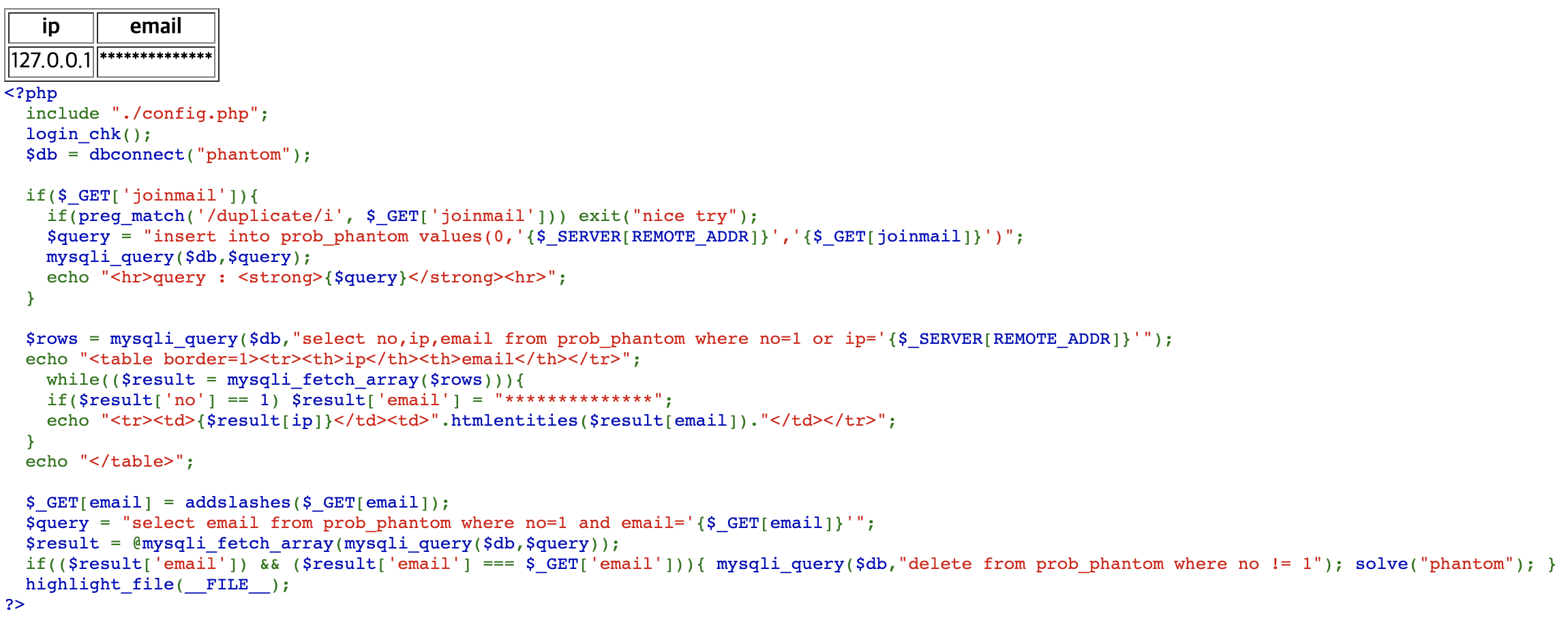 joinmail 이후 select no,ip,email from prob_phantom where no=1 or ip='{$_SERVER[REMOTE_ADDR]}'를 실행하여 DB에 내 IP로 저장된 email이 있는지 조회를 한다.