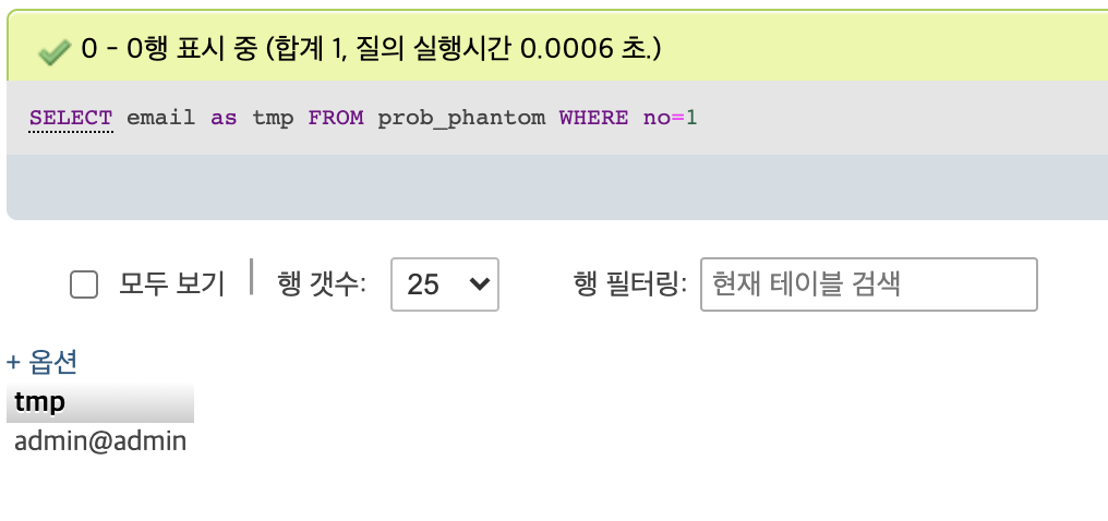 쿼리문을 자세히 설명하자면, SELECT email as tmp FROM prob_phantom WHERE no=1은 사진과 같은 결과를 반환한다. 또한 이 반환값은 앞의 SELECT tmp FROM에 의해 prob_phantom이 아닌 반환값에서 tmp로 출력된다.