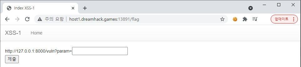 URL을 입력하여 XSS 취약점을 발현시키고 플래그를 획득하는 문제이다. 접속해보자.