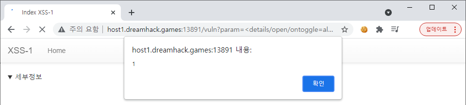 | payload : http://host1.dreamhack.games:13891/vuln?param=<details/open/ontoggle=alert(1)> |