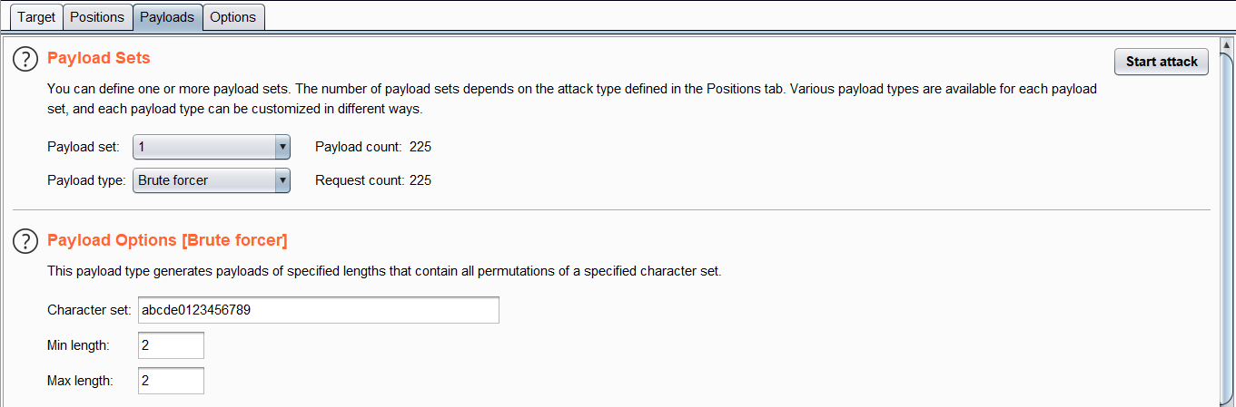 payload 타입은 brute forcer 이며, 1Byte의 Hex 값을 구하는 것이기 때문에