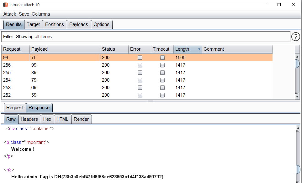 result 패킷 중 유일하게 응답 Length가 다른 패킷이 확인되었으며, 거기에서 플래그를 확인할 수 있었다.
