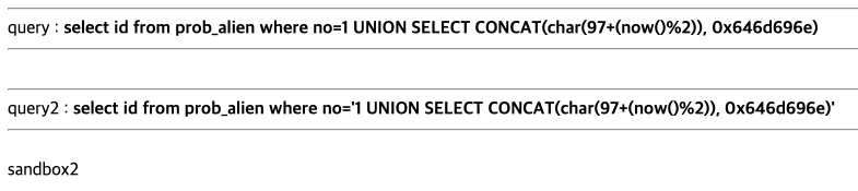 나는 SELECT id FROM prob_alien WHERE no='1 UNION SELECT CONCAT(char(97+(!sleep(1)&&now()%2=1)), 0x646d696e)'