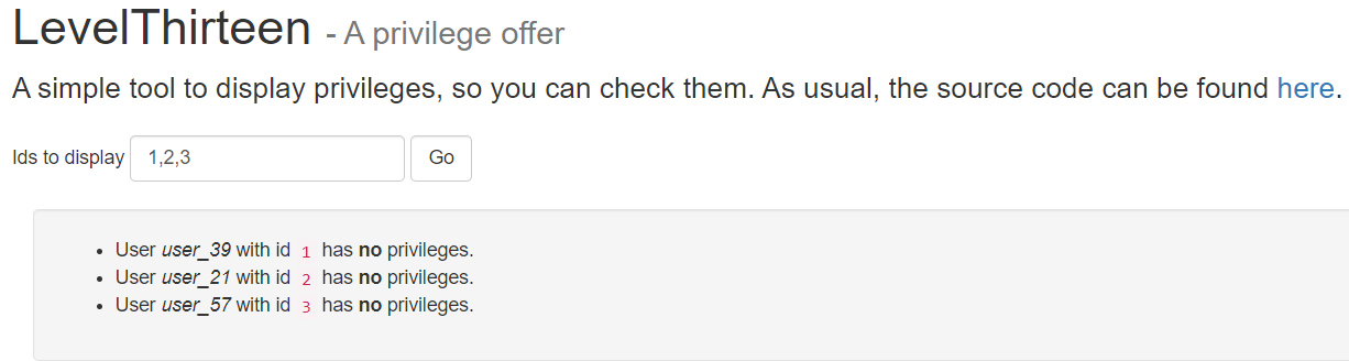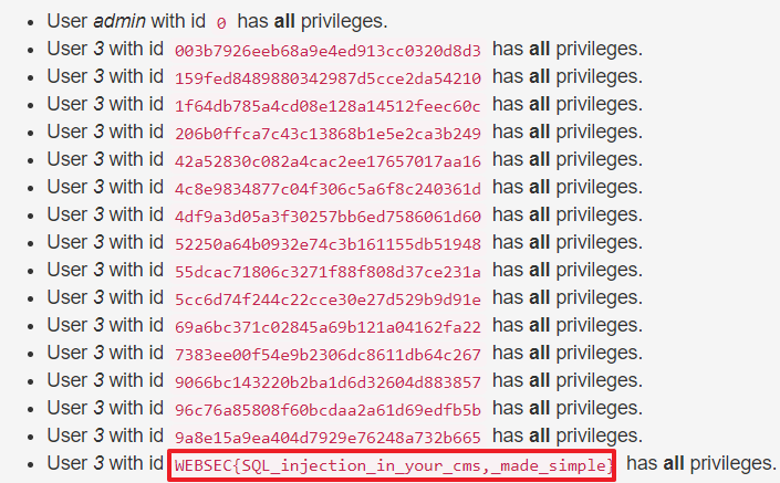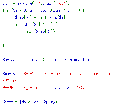 Season 1/워게임 [websec.fr] easy - Level 13 작성자 - 호롤로롤 첫 화면에 1,2,3 디폴트로 값이 들어가 있는것을 확인하고 go를 눌러 결과 값을 확인해보았다. 각 id에 해당하는 값과 권한을 출력해주는 것 같다. 소스코드를 보니 가장 먼저 쿼리문이 보인다. SELECT user_id, user_privileges, user_name FROM users WHERE (user_id in (".$selector.")); 보니 tmp 값이 implode 되어 쿼리 문에 들어가서 출력되는것 같다. 여기서 보아야 할 포인트는 tmp값이 1미만일 경우 unset 함수를 호출 한다는 것이다. 그러면서 count값이 줄어들면서 반복하는데 그러다보면 배열 끝에 있는 일부 요소 체크하지 않게 되는점을 이용한다. 일단 user_password에 flag 값이 있을 것이라고 추측하여 쿼리를 만들면 앞선 구문을 맞추기 위해서 아래와 같이 된다. )) union select user_password,user_name,3 from users-- 또한 임의로 체크 값을 체크하지 못하도록 0을 계속해서 추가해 주다보면 우리는 flag 값을 얻을 수 있다. 페이로드 0,0,0,0)) union select user_password,user_name,3 from users-- 공유하기 게시글 관리 MSS 'Season 1 > 워게임' 카테고리의 다른 글 [dreamhack] rev-basic-0 문제풀이 (1) 2021.09.12 [Lord of SQLInjection] Godzilla Write UP (0) 2021.09.12 [Lord of SQLInjection] Death Write UP (0) 2021.09.10 [Lord of SQLInjection] Cthulhu Write UP (0) 2021.09.09 [Root-Me]/Web Server/Weak password (0) 2021.09.08 Contents 당신이 좋아할만한 콘텐츠 [dreamhack] rev-basic-0 문제풀이 2021.09.12 [Lord of SQLInjection] Godzilla Write UP 2021.09.12 [Lord of SQLInjection] Death Write UP 2021.09.10 [Lord of SQLInjection] Cthulhu Write UP 2021.09.09 댓글 0 + 이전 댓글 더보기