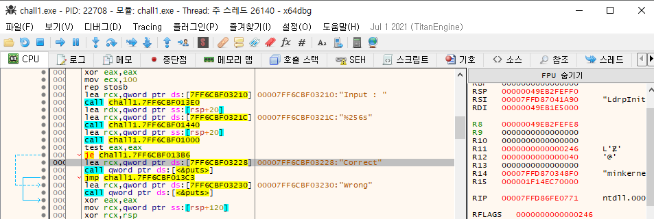 Season 1/워게임 [dreamhack] rev-basic-1 문제풀이 작성자 - S1ON [Reversing] rev-basic-1 문제풀이 문제를 확인해보자. 어라 rev-basic-1 문제랑 똑같다. 프로그램만 다른가보다. x64dbg로 해당 파일을 열어보자. correct를 출력하는 flag 값을 찾아야하기 때문에 문자열 참조 찾기를 통해 correct 문자열을 찾아보자. 사용자가 FLAG를 입력하고 chall1.7FF6CBF01000 함수에서 입력 값 비교를 한 뒤, Correct/Wrong 메시지를 출력한다. 해당 함수를 따라가보자. 비교를 수행하는 cmp 구문에서 비교 문자열이 확인된다. 해당 문자를 조합하면 "Compar3_the_ch4ract3r" 이다. 입력 값으로 넣어보자. 문제풀이 끗 공유하기 게시글 관리 MSS 'Season 1 > 워게임' 카테고리의 다른 글 [dreamhack] rev-basic-2 문제풀이 (0) 2021.09.12 [Lord of SQLInjection] Cyclops Write UP (0) 2021.09.12 [dreamhack] rev-basic-0 문제풀이 (1) 2021.09.12 [Lord of SQLInjection] Godzilla Write UP (0) 2021.09.12 [websec.fr] easy - Level 13 (0) 2021.09.12 Contents 당신이 좋아할만한 콘텐츠 [dreamhack] rev-basic-2 문제풀이 2021.09.12 [Lord of SQLInjection] Cyclops Write UP 2021.09.12 [dreamhack] rev-basic-0 문제풀이 2021.09.12 [Lord of SQLInjection] Godzilla Write UP 2021.09.12 댓글 0 + 이전 댓글 더보기