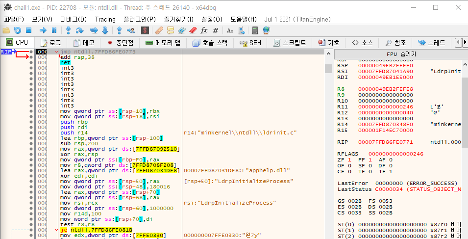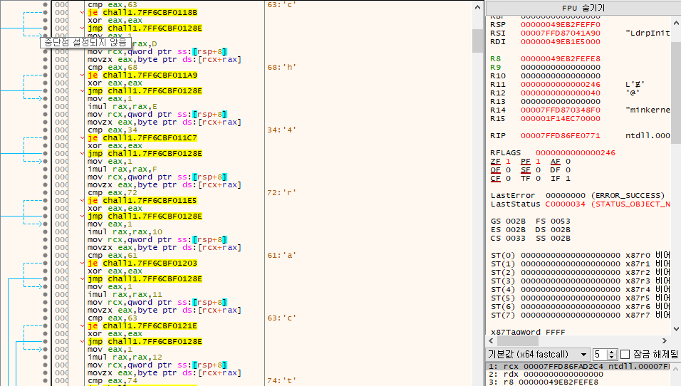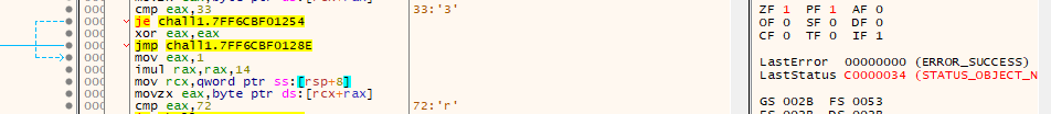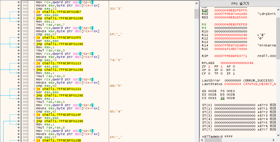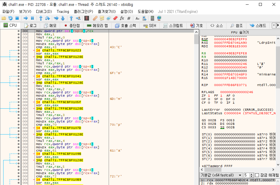 Season 1/워게임 [dreamhack] rev-basic-1 문제풀이 작성자 - S1ON [Reversing] rev-basic-1 문제풀이 문제를 확인해보자. 어라 rev-basic-1 문제랑 똑같다. 프로그램만 다른가보다. x64dbg로 해당 파일을 열어보자. correct를 출력하는 flag 값을 찾아야하기 때문에 문자열 참조 찾기를 통해 correct 문자열을 찾아보자. 사용자가 FLAG를 입력하고 chall1.7FF6CBF01000 함수에서 입력 값 비교를 한 뒤, Correct/Wrong 메시지를 출력한다. 해당 함수를 따라가보자. 비교를 수행하는 cmp 구문에서 비교 문자열이 확인된다. 해당 문자를 조합하면 "Compar3_the_ch4ract3r" 이다. 입력 값으로 넣어보자. 문제풀이 끗 공유하기 게시글 관리 MSS 'Season 1 > 워게임' 카테고리의 다른 글 [dreamhack] rev-basic-2 문제풀이 (0) 2021.09.12 [Lord of SQLInjection] Cyclops Write UP (0) 2021.09.12 [dreamhack] rev-basic-0 문제풀이 (1) 2021.09.12 [Lord of SQLInjection] Godzilla Write UP (0) 2021.09.12 [websec.fr] easy - Level 13 (0) 2021.09.12 Contents 당신이 좋아할만한 콘텐츠 [dreamhack] rev-basic-2 문제풀이 2021.09.12 [Lord of SQLInjection] Cyclops Write UP 2021.09.12 [dreamhack] rev-basic-0 문제풀이 2021.09.12 [Lord of SQLInjection] Godzilla Write UP 2021.09.12 댓글 0 + 이전 댓글 더보기