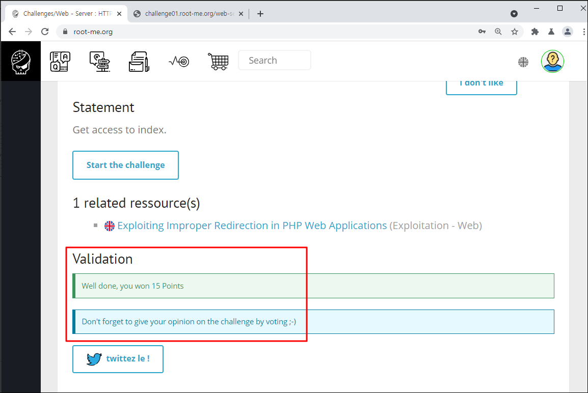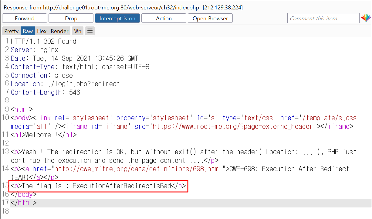 Season 1/워게임 [Root-Me]/Web Server/HTTP - Improper redirect 작성자 - 한수임 문제풀이 바로 가보겠습니다. 1. 문제 문제 접근 시 이 페이지에 접근하기 위해서는 인증이 되어야 한다고 하며, Login, Pw를 요구하고 있습니다. 2. 문제풀이 ID, PW를 입력하는 곳에 임의의 값을 넣어 보았습니다. ID/PW에 admin/admin 값을 입력하니, 인증 실패라는 구문이 떴으며, 요청 응답 패킷에도 특별한 힌트는 없었습니다. 문제 접근 전 힌트를 참고하니, Get access to index. 라는 구문이 보이네요. index 파일에 접근하라는 문제가 보이네요. 그래서 index.php파일에 접근해 보았습니다. 요청 패킷에서 index.php 파일에 접근해 보았습니다. 응답 패킷에 플래그 값이 노출되네요. 또한 헤더 값에 Location 뒤에 종료되는 부분이 없다면 PHP는 지속적으로 실행하며, 페이지 컨텐츠를 보낸다고 설명해주고 있습니다. 아래 CWE-698 은 리다이렉트 후 실행이라는 설명 사이트를 적어놓았네요 이제 플래그 값을 검증해보니... 파랑새가 나왔습니다. 문제풀이 끄읏~ 문제 푸니 추가로 좋은 정보까지 얻게 되었다. 공유하기 게시글 관리 MSS 'Season 1 > 워게임' 카테고리의 다른 글 [dreamhack] rev-basic-4 문제풀이 (0) 2021.09.16 [Lord of SQLInjection] Poltergeist Write UP (0) 2021.09.15 [Root-Me]/Web Server/HTTP - POST (0) 2021.09.14 [Lord of SQLInjection] banshee Write UP (0) 2021.09.14 [Root-Me]/Web Server/HTTP - Headers (0) 2021.09.13 Contents 당신이 좋아할만한 콘텐츠 [dreamhack] rev-basic-4 문제풀이 2021.09.16 [Lord of SQLInjection] Poltergeist Write UP 2021.09.15 [Root-Me]/Web Server/HTTP - POST 2021.09.14 [Lord of SQLInjection] banshee Write UP 2021.09.14 댓글 0 + 이전 댓글 더보기
