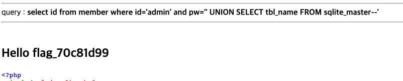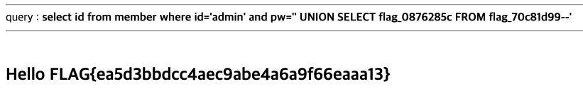 id='admin' and pw='공격 백터 pw'인 member 변수에 저장된 id을 반환하는 쿼리문이다. 만약 쿼리문 반환 값이 있다면, hello 반환 값을 페이지에 출력한다.