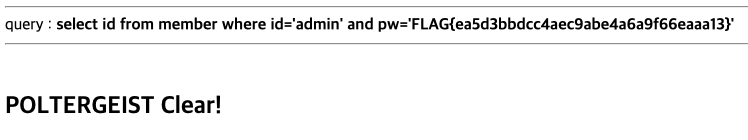 if($poltergeistFlag === $_GET['pw']) solve("poltergeist");// Flag is in `flag_{$hash}` table, not in `member` table. Let's look over whole of the database.