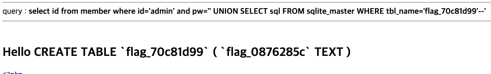 id='admin' and pw='공격 백터 pw'인 member 변수에 저장된 id을 반환하는 쿼리문이다. 만약 쿼리문 반환 값이 있다면, hello 반환 값을 페이지에 출력한다.