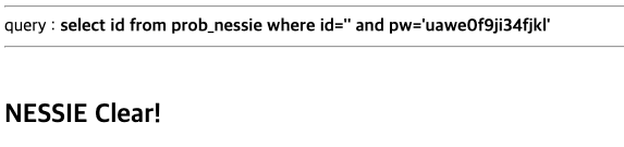 쿼리문은 id='공격 백터 id' and pw='공격 백터 pw'인 prob_nessie 테이블에 저장된 id을 반환하게 된다.