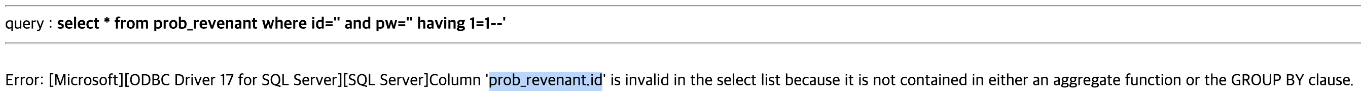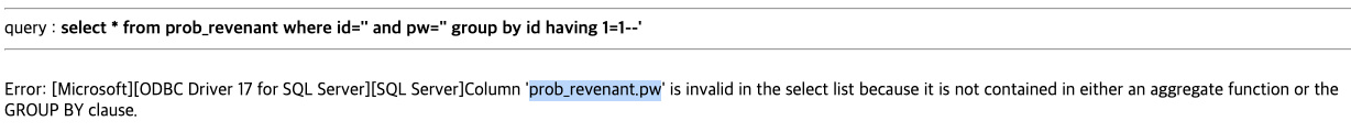필터링에 통과한 공격 백터 id와 pw는 SELECT * FROM porb_revenant WHERE id='공격 백터 id' and pw='공격 백터 pw'에 들어가게 된다.