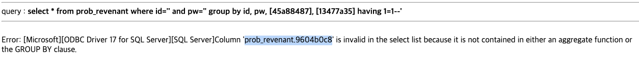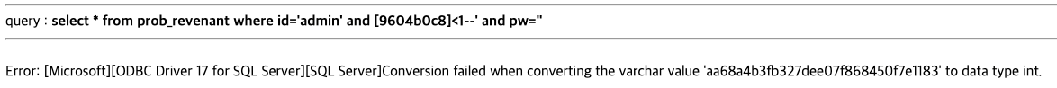 이후, id가 admin이면서 9604b0c8 컬럼의 값을 비교하는데 일부러 Error를 나오게 넣으면 그 값이 출력이 된다.