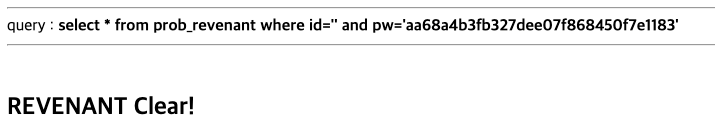 필터링에 통과한 공격 백터 id와 pw는 SELECT * FROM porb_revenant WHERE id='공격 백터 id' and pw='공격 백터 pw'