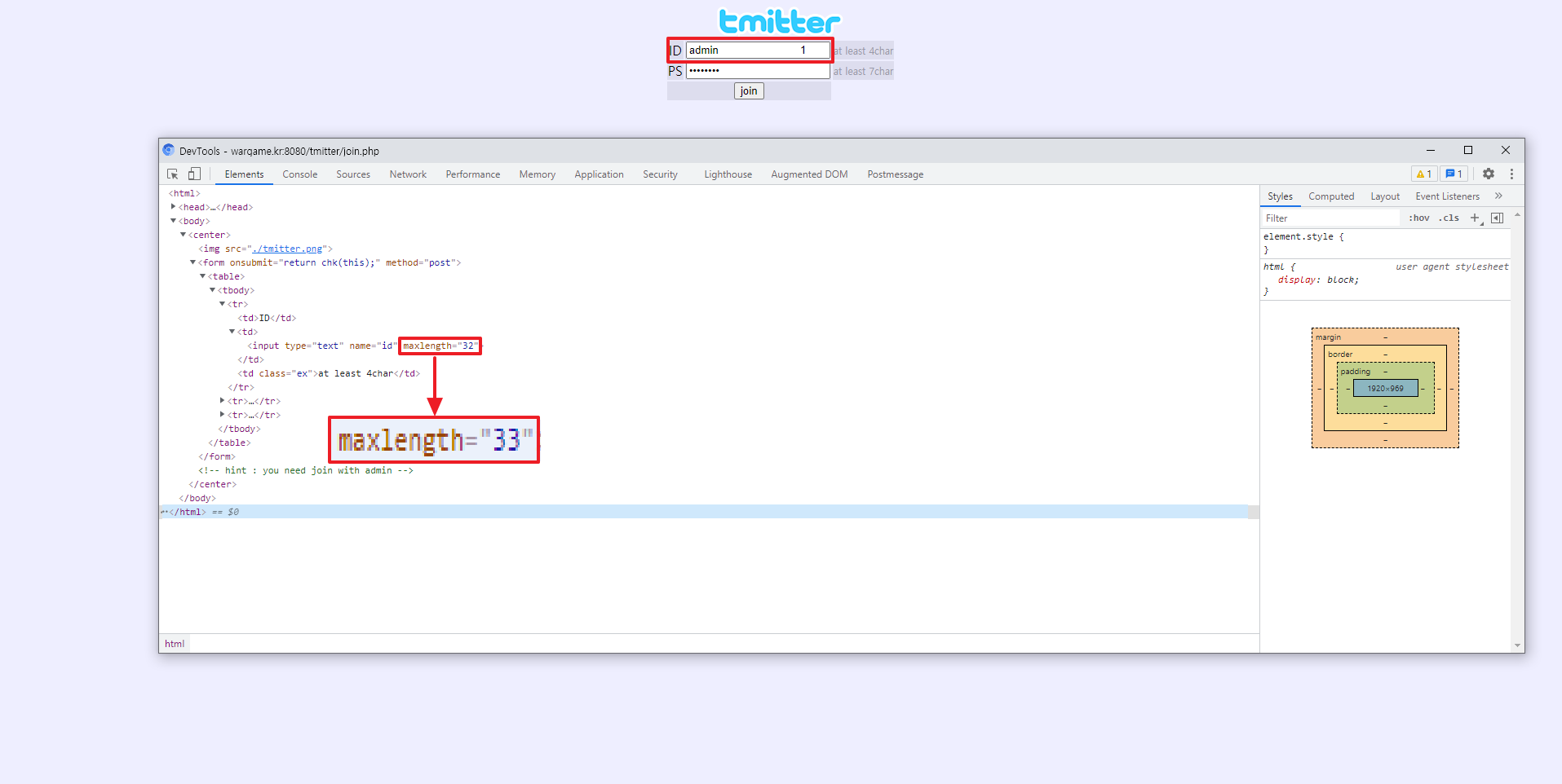 위 사진과 같이 maxlength를 32 -> 33으로 바꿔주고 'admin 1'(33자)으로 가입시 32자만 검증을하게 되서 admin으로 가입할 수 있게 된다.