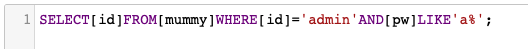 query = f"query=[id]FROM[prob_mummy]WHERE[id]='admin'AND[pw]LIKE'{pw + s}%'"