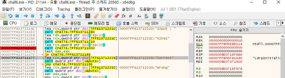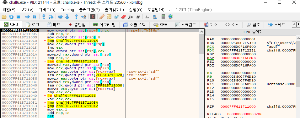 사용자가 FLAG를 입력하고 chall6.7FF613711000 함수에서 입력 값 비교를 한 뒤,
