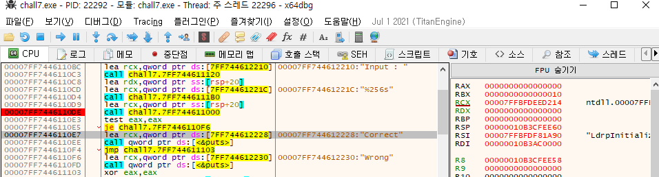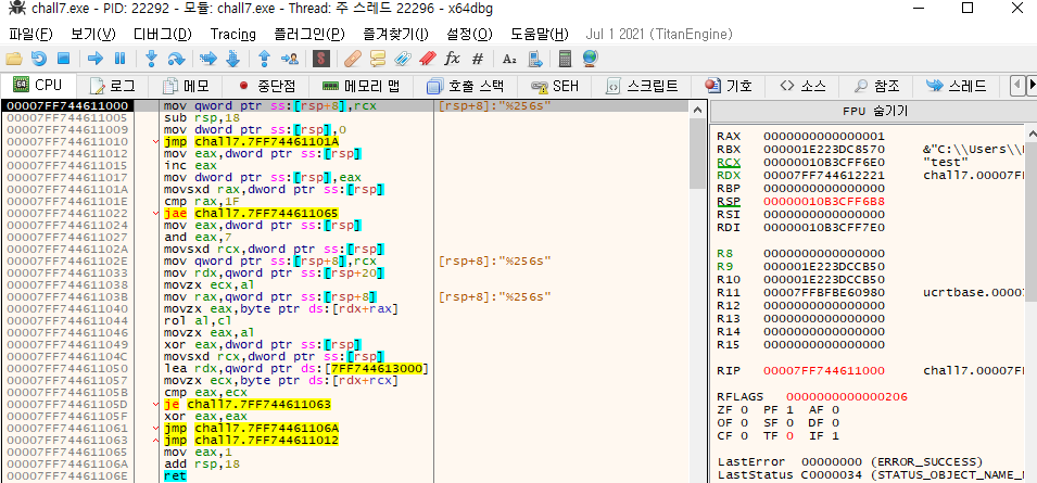 Season 1/워게임 [dreamhack] rev-basic-7 문제풀이 작성자 - S1ON [Reversing] rev-basic-7 문제풀이 문제를 확인해보자. Correct를 출력하는 FLAG 값을 찾는 문제이다. 문제 파일을 x64dbg 프로그램으로 열어보자. correct를 출력하는 flag 값을 찾아야하기 때문에 문자열 참조 찾기를 통해 correct 문자열을 찾아보자. 사용자가 FLAG를 입력하고 chall7.7FF744611000 함수에서 입력 값 비교를 한 뒤, Correct/Wrong 메시지를 출력한다. 해당 함수를 따라가보자. 위 함수에서 사용자 입력 값에 대해 수행하는 연산은 다음과 같다. [cmp rax, 1F] // 32번 반복 [and eax, 7] // eax에 7과 and 연산한 값을 저장 [movzx ecx, al] // 공유하기 게시글 관리 MSS 'Season 1 > 워게임' 카테고리의 다른 글 [Root-Me]/Web Server/HTTP - Cookies (0) 2021.10.13 Wargame - dmbs335 (0) 2021.10.03 [dreamhack] rev-basic-6 문제풀이 (0) 2021.09.30 Wargame - SimpleBoard (0) 2021.09.26 Wargame - web chatting (0) 2021.09.26 Contents 당신이 좋아할만한 콘텐츠 [Root-Me]/Web Server/HTTP - Cookies 2021.10.13 Wargame - dmbs335 2021.10.03 [dreamhack] rev-basic-6 문제풀이 2021.09.30 Wargame - SimpleBoard 2021.09.26 댓글 0 + 이전 댓글 더보기