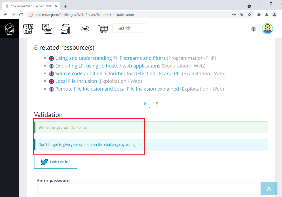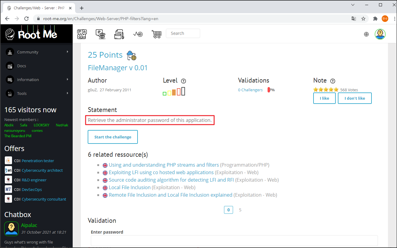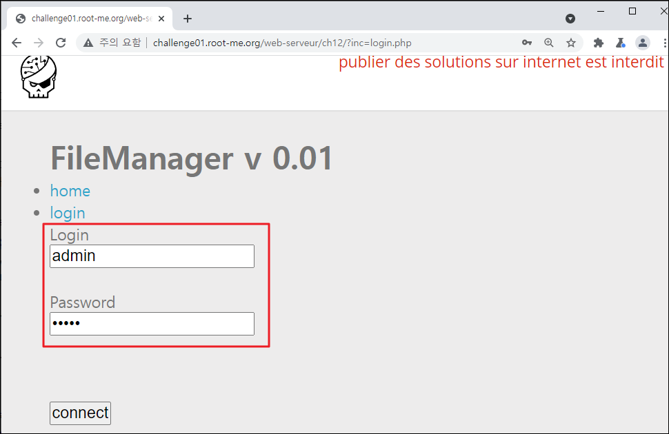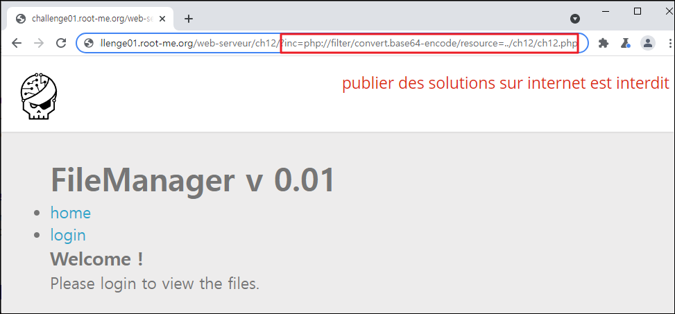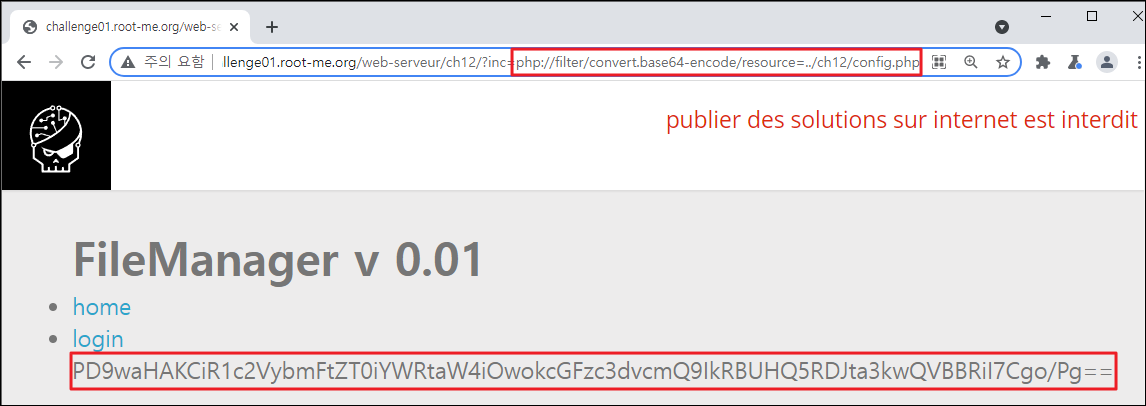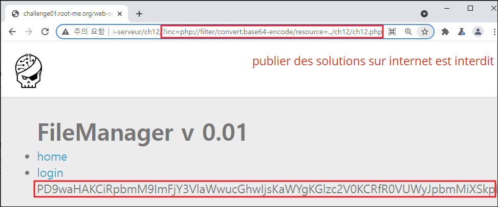 Season 1/워게임 [Root-Me]/Web Server/PHP - Filters 작성자 - 한수임 10월은 할 일이 많아 조금 늦었네요 문제풀이 바로 시작해보도록 하겠습니다. 문제 문제 접근 시 home, login 등 기능이 보이네요 문제풀이 무엇을 먼저 해야 할지 몰라 문제 접근 전 힌트를 보았습니다. 이 애플리케이션의 관리자 패스워드를 찾으라는 것으로 보이네요. home 기능을 사용해 보니 딱히 기능이 있어 보이지 않았습니다. 이후 로그인 기능을 사용해 보았습니다. ID/PW에 admin/admin을 입력해 보았습니다. 에러가 뜨며 로그인되지 않더군요. URL을 통해 관리자 페이지가 존재할지 몰라 admin.php를 입력해 보았습니다. 아래와 같은 하위 폴더가 존재하네요 접근해도 별다른 반응이 없습니다. 이 부분부터 막혀서 검색해 본 결과 php wrapper라는 것이 존재하더라고요 그중 php://filter라는 것이 존재하였으며, 이번 주제와 맞게 이 방식을 활용해야 할 것 같습니다. 간단하게 설명하자면 encode/decode 옵션을 사용하여 서버 안에 존재하는 문서를 열람할 수 있다고 하네요. 공격법은 www.(대상 사이트 주소 및 하위 폴더)/?파라미터=php://filter/convert.base64-encode/resourc=(열람할 문서의 경로) 입니다. 위의 공격법을 적용해 보겠습니다. inc 파라미터에 php filter wrapper를 적용해 보았습니다. ch12.php안의 내용이 인코딩 되어 나왔네요 이것을 디코딩해보겠습니다. 디코딩한 결과에 config.php 파일이 있네요 이 파일도 wrapper 해보겠습니다. config.php 파일의 인코딩 결과가 나오네요 이 부분을 디코딩해보니... admin계정의 패스워드가 나왔습니다. 이 부분을 검증해보니... 파랑새가 나왔습니다. 한동안 문제를 못 풀다가 이제 다시 열심히 진행해야겠다. 문제풀이 끄읏~ 공유하기 게시글 관리 MSS 'Season 1 > 워게임' 카테고리의 다른 글 [Dreamhack Web - Lv 1] Tomcat Manager (0) 2021.11.24 [Dreamhack Web - Lv 1] mongoboard (0) 2021.11.10 [dreamhack] baby-sqlite 문제풀이 (0) 2021.10.20 [Root-Me]/Web Server/SQL injection - Authentication (0) 2021.10.13 [Root-Me]/Web Server/HTTP - Cookies (0) 2021.10.13 Contents 당신이 좋아할만한 콘텐츠 [Dreamhack Web - Lv 1] Tomcat Manager 2021.11.24 [Dreamhack Web - Lv 1] mongoboard 2021.11.10 [dreamhack] baby-sqlite 문제풀이 2021.10.20 [Root-Me]/Web Server/SQL injection - Authentication 2021.10.13 댓글 0 + 이전 댓글 더보기