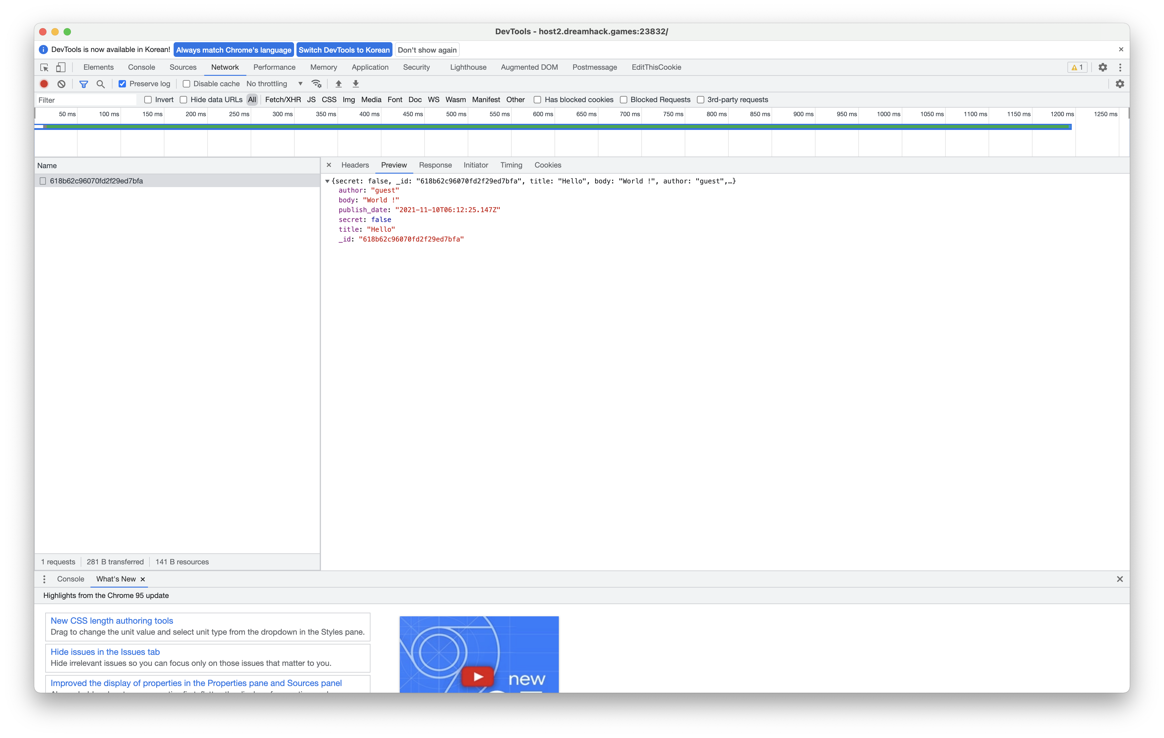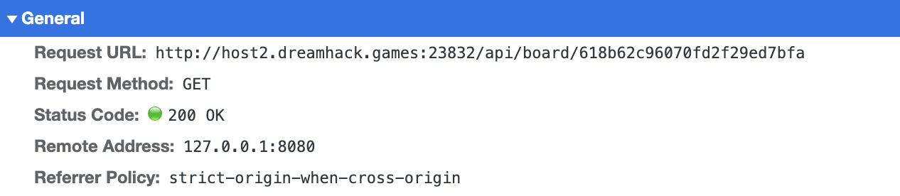 JSON 형식의 데이터를 넘겨준 서버의 주소를 확인해보니, api/board에서 넘겨주는 것을 볼 수 있었다. 이처럼 API 서버가 있다는 것은 혹시 no 값을 넘겨주면 내용도 넘겨주는 기능도 만들어서 게시물 내용을 채우도록 하지 않았을까? 라는 생각으로 발전하여 첫번째 게시물의 네트워크도 살펴봤다.