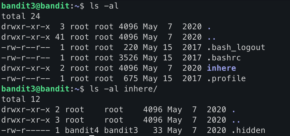 Season 1/워게임 [OverTheWire System - Bandit] Level 3 >> Level 4 작성자 - LRTK Level Goal The password for the next level is stored in a hidden file in the inhere directory. 다음 단계의 암호는 이 디렉토리의 숨겨진 파일에 저장됩니다. Hint 1. ls 명령어 2. cat 명령어 3. 리눅스 숨겨진 파일 Write Up 더보기 ls 명령어로 홈 디렉토리를 확인해보니, inhere 디렉토리가 있었다.그래서 안에 뭐가 있는지 궁금하여 inhere 디렉토리도 확인하였다. 확인 한 결과 .hidden 파일이 있다는 것을 알 수 있었다. file 이름 앞에 .이 있다는 것은 숨긴 파일이라는 뜻이다. cat 명령어를 사용하여 .hidden 파일을 확인해봤다. bandit4 :: pIwrPrtPN36QITSp3EQaw936yaFoFgAB 공유하기 게시글 관리 MSS 'Season 1 > 워게임' 카테고리의 다른 글 [OverTheWire System - Bandit] Level 5 >> Level 6 (0) 2021.11.24 [OverTheWire System - Bandit] Level 4 >> Level 5 (0) 2021.11.24 [OverTheWire System - Bandit] Level 2 >> Level 3 (0) 2021.11.24 [OverTheWire System - Bandit] Level 1 >> Level 2 (0) 2021.11.24 [OverTheWire System - Bandit] Level 0 >> Level 1 (0) 2021.11.24 Contents 당신이 좋아할만한 콘텐츠 [OverTheWire System - Bandit] Level 5 >> Level 6 2021.11.24 [OverTheWire System - Bandit] Level 4 >> Level 5 2021.11.24 [OverTheWire System - Bandit] Level 2 >> Level 3 2021.11.24 [OverTheWire System - Bandit] Level 1 >> Level 2 2021.11.24 댓글 0 + 이전 댓글 더보기