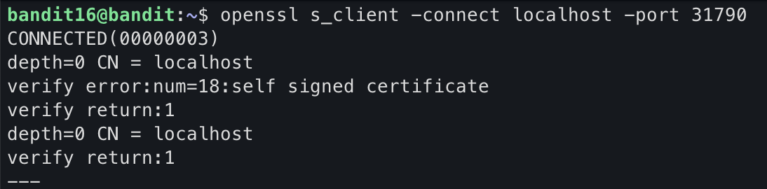다음 레벨의 암호는 현재 레벨의 암호를 31000 ~ 32000 범위의 localhost에 있는 포트에 제출하여 검색할 수 있습니다. 먼저 이러한 포트 중 어떤 포트에서 수신 대기하는 서버가 있는지 확인합니다. 그런 다음 SSL을 사용하는 것과 그렇지 않은 것을 찾으십시오. 다음 자격 증명을 제공할 서버는 1개뿐이며 나머지 서버는 귀하가 보내는 모든 것을 다시 귀하에게 보낼 것입니다.