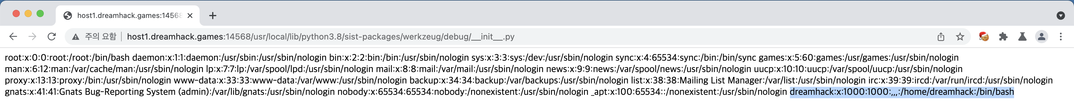 일단 app.py를 실행하는 사용자 이름을 찾으려고 /etc/passwd 파일을 출력하였다.확인해보니 의심이 가는 사용자 이름인 dreamhack이 보였다.