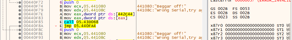 Season 1/워게임 [CodeEngn] Basic RCE L05 문제풀이 작성자 - S1ON 문제 정보 이 프로그램의 등록키는 무엇인가 풀이 힌트 2-1. Packing 2-2. UPX 문제 풀이 더보기 3-1. 잘못된 키를 입력하면 "Wrong Serial, try again!" 이라는 문구를 출력하는 프로그램이다. 3-2. "Wrong Serial, try again!" 문자열의 주소를 확인한다. ※ 프로그램 실행해야만 해당 문자열이 검색된다. 여기에서 패킹을 의심했어야 한다. 3-3. 에러 문구를 출력하는 주소를 따라가면 [call 05.403B2C] 함수 호출 후 결과 메시지를 출력하는 것을 알 수 있다. 3-4. [call 05.403B2C] 함수의 호출 전/후로 BP를 걸어서 확인해보자 3-5. BP를 걸고 프로그램을 재실행해보니 별다른 변화가 없고 BP가 비활성화 되어있다. 3-6. 프로그램이 패킹되어 있는 것 같다. PEiD를 이용해 확인해보니 UPX로 패킹되어 있음을 알 수 있다. 3-7. UPX를 이용해 언패킹한다. 3-8. 패킹 이후 프로그램을 다시 디버깅하여 문자열 참조 시 키로 의심되는 값이 보인다. 3-9. 입력한 키 값의 참/거짓을 판별하는 함수 호출 전에 브레이크 포인트를 설정한다. 3-10. 키 값을 [754-GFX-IER-954] 에서 [GFX-754-IER-954]로 변경하고 실행했음에도 또 실패했다. 키 값의 참/거짓을 판별하는 BP에 걸리지 않고 지나쳤다. 에러 메시지를 출력하는 다른 분기문이 추가로 있다고 판단할 수 있다. 3-11. 코드를 잘 살펴보니 "Wrong" 메시지를 출력하는 주소코드는 두 개이고 각각 [00440F72], [00440F8C]로 확인된다. 3-12. 기존에 BP를 설정했던 함수 호출 뒤에는 값이 다를 시에 [00440F72] 주소로 분기하고, 그 위에 [00440F34] 주소에서 추가적인 로직 검증이 있는 것으로 확인된다. 3-13. 추가로 확인되는 값 검증 부분에 BP를 설정하고 실행해보니, 키 위에 적힌 "Unregistered..." 문자열과 "Registered User" 문자열을 매개로 받는 것을 확인할 수 있는데 키 외에도 추가로 문자열 비교를 하는 것으로 보인다, 3-14. User와 Key를 입력 후 프로그램 실행 결과 정상적으로 키 검증이 완료됐다. 3-15. (정답) 이 프로그램의 키는 GFX-754-IER-954 이다. 공유하기 게시글 관리 MSS 'Season 1 > 워게임' 카테고리의 다른 글 [CodeEngn] Basic RCE L07 문제풀이 (0) 2021.12.31 [CodeEngn] Basic RCE L06 문제풀이 (0) 2021.12.30 [CodeEngn] Basic RCE L04 문제풀이 (0) 2021.12.29 [CodeEngn] Basic RCE L03 문제풀이 (0) 2021.12.29 [CodeEngn] Basic RCE L02 문제풀이 (0) 2021.12.27 Contents 당신이 좋아할만한 콘텐츠 [CodeEngn] Basic RCE L07 문제풀이 2021.12.31 [CodeEngn] Basic RCE L06 문제풀이 2021.12.30 [CodeEngn] Basic RCE L04 문제풀이 2021.12.29 [CodeEngn] Basic RCE L03 문제풀이 2021.12.29 댓글 0 + 이전 댓글 더보기