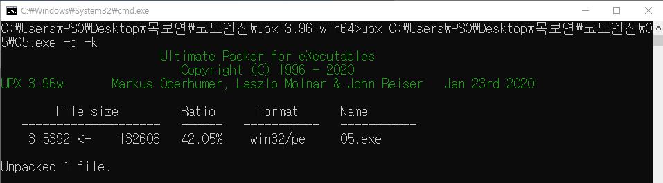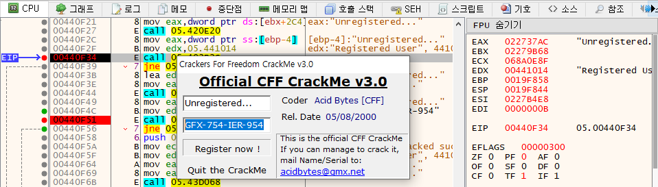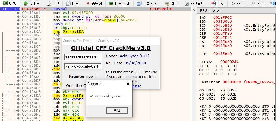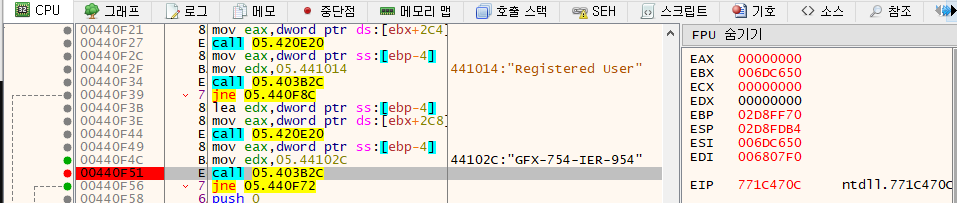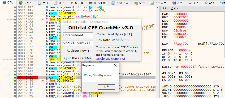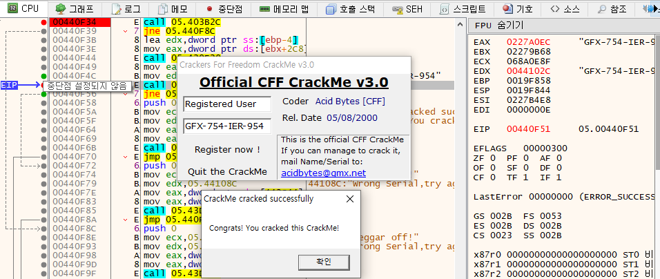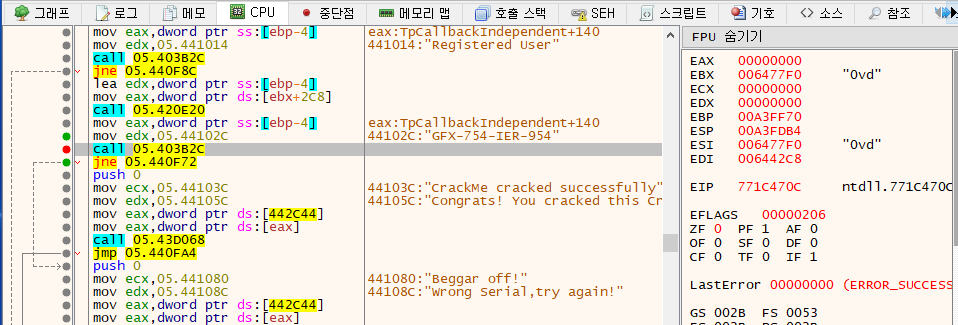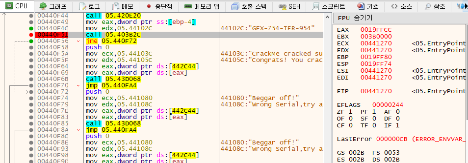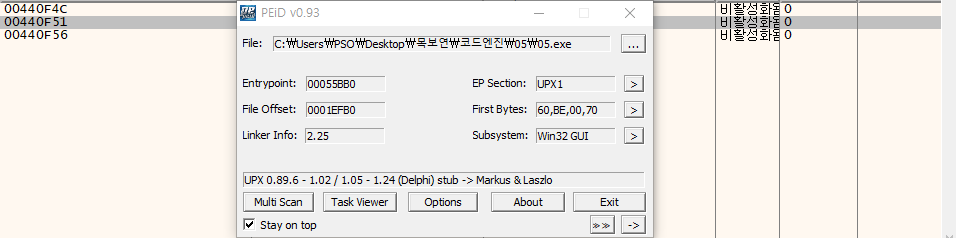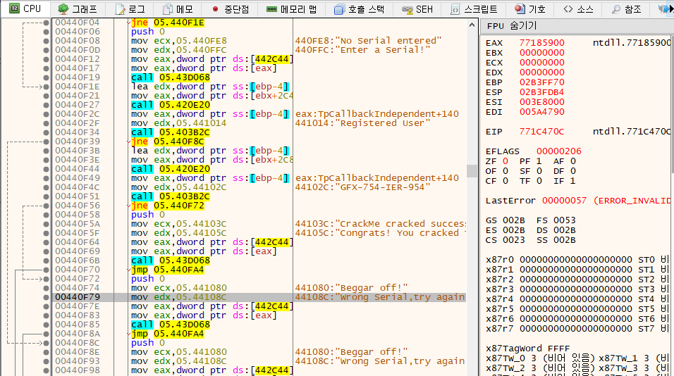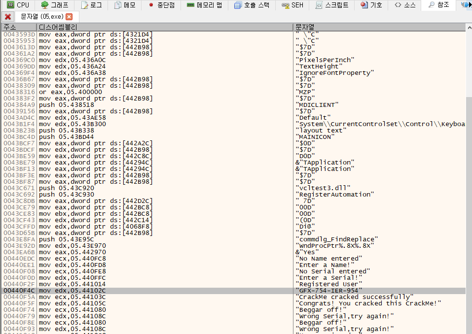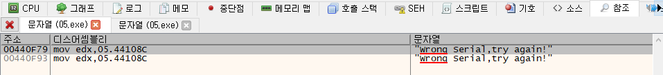 Season 1/워게임 [CodeEngn] Basic RCE L05 문제풀이 작성자 - S1ON 문제 정보 이 프로그램의 등록키는 무엇인가 풀이 힌트 2-1. Packing 2-2. UPX 문제 풀이 더보기 3-1. 잘못된 키를 입력하면 "Wrong Serial, try again!" 이라는 문구를 출력하는 프로그램이다. 3-2. "Wrong Serial, try again!" 문자열의 주소를 확인한다. ※ 프로그램 실행해야만 해당 문자열이 검색된다. 여기에서 패킹을 의심했어야 한다. 3-3. 에러 문구를 출력하는 주소를 따라가면 [call 05.403B2C] 함수 호출 후 결과 메시지를 출력하는 것을 알 수 있다. 3-4. [call 05.403B2C] 함수의 호출 전/후로 BP를 걸어서 확인해보자 3-5. BP를 걸고 프로그램을 재실행해보니 별다른 변화가 없고 BP가 비활성화 되어있다. 3-6. 프로그램이 패킹되어 있는 것 같다. PEiD를 이용해 확인해보니 UPX로 패킹되어 있음을 알 수 있다. 3-7. UPX를 이용해 언패킹한다. 3-8. 패킹 이후 프로그램을 다시 디버깅하여 문자열 참조 시 키로 의심되는 값이 보인다. 3-9. 입력한 키 값의 참/거짓을 판별하는 함수 호출 전에 브레이크 포인트를 설정한다. 3-10. 키 값을 [754-GFX-IER-954] 에서 [GFX-754-IER-954]로 변경하고 실행했음에도 또 실패했다. 키 값의 참/거짓을 판별하는 BP에 걸리지 않고 지나쳤다. 에러 메시지를 출력하는 다른 분기문이 추가로 있다고 판단할 수 있다. 3-11. 코드를 잘 살펴보니 "Wrong" 메시지를 출력하는 주소코드는 두 개이고 각각 [00440F72], [00440F8C]로 확인된다. 3-12. 기존에 BP를 설정했던 함수 호출 뒤에는 값이 다를 시에 [00440F72] 주소로 분기하고, 그 위에 [00440F34] 주소에서 추가적인 로직 검증이 있는 것으로 확인된다. 3-13. 추가로 확인되는 값 검증 부분에 BP를 설정하고 실행해보니, 키 위에 적힌 "Unregistered..." 문자열과 "Registered User" 문자열을 매개로 받는 것을 확인할 수 있는데 키 외에도 추가로 문자열 비교를 하는 것으로 보인다, 3-14. User와 Key를 입력 후 프로그램 실행 결과 정상적으로 키 검증이 완료됐다. 3-15. (정답) 이 프로그램의 키는 GFX-754-IER-954 이다. 공유하기 게시글 관리 MSS 'Season 1 > 워게임' 카테고리의 다른 글 [CodeEngn] Basic RCE L07 문제풀이 (0) 2021.12.31 [CodeEngn] Basic RCE L06 문제풀이 (0) 2021.12.30 [CodeEngn] Basic RCE L04 문제풀이 (0) 2021.12.29 [CodeEngn] Basic RCE L03 문제풀이 (0) 2021.12.29 [CodeEngn] Basic RCE L02 문제풀이 (0) 2021.12.27 Contents 당신이 좋아할만한 콘텐츠 [CodeEngn] Basic RCE L07 문제풀이 2021.12.31 [CodeEngn] Basic RCE L06 문제풀이 2021.12.30 [CodeEngn] Basic RCE L04 문제풀이 2021.12.29 [CodeEngn] Basic RCE L03 문제풀이 2021.12.29 댓글 0 + 이전 댓글 더보기