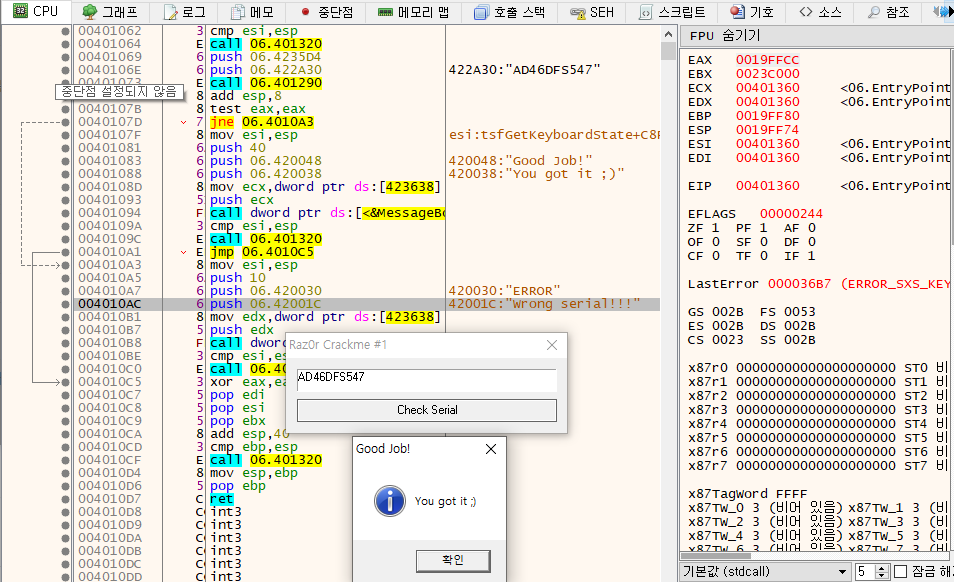 Season 1/워게임 [CodeEngn] Basic RCE L06 문제풀이 작성자 - S1ON 문제 정보 Unpack을 한 후 Serial을 찾으시오. 정답인증은 OEP + Serial Ex) 004000000PASSWORD 풀이 힌트 2-1. Packing 2-2. OEP 문제 풀이 더보기 3-1. PEiD를 통해 UPX로 패킹된 것을 확인하고, UPX 실행파일을 통해 언패킹을 수행한다. 3-2. 문자열 참조를 통해 "Wrong Serial!!!" 에러 메시지를 출력하는 주소를 확인한다. 3-3. 주소를 따라가보니 [00401073] 주소에서 호출된 함수 리턴 값으로 참/거짓이 판단되는 것을 확인할 수 있고, 함수 매개변수로 "AD46DFS547"가 전달된다. 3-4. 강력한 직감에 의지하여 "AD46DFS547" 문자열을 시리얼 키로 입력하니 참을 나타내는 문자열이 출력됐다. 3-5. OEP는 [00401360] 이고, PASSWORD는 "AD46DFS547" 이므로 정답은 "00401360AD46DFS547" 이다. 공유하기 게시글 관리 MSS 'Season 1 > 워게임' 카테고리의 다른 글 [Root-Me]/Web Server/File upload - Double extensions (0) 2022.01.14 [CodeEngn] Basic RCE L07 문제풀이 (0) 2021.12.31 [CodeEngn] Basic RCE L05 문제풀이 (0) 2021.12.30 [CodeEngn] Basic RCE L04 문제풀이 (0) 2021.12.29 [CodeEngn] Basic RCE L03 문제풀이 (0) 2021.12.29 Contents 당신이 좋아할만한 콘텐츠 [Root-Me]/Web Server/File upload - Double extensions 2022.01.14 [CodeEngn] Basic RCE L07 문제풀이 2021.12.31 [CodeEngn] Basic RCE L05 문제풀이 2021.12.30 [CodeEngn] Basic RCE L04 문제풀이 2021.12.29 댓글 0 + 이전 댓글 더보기