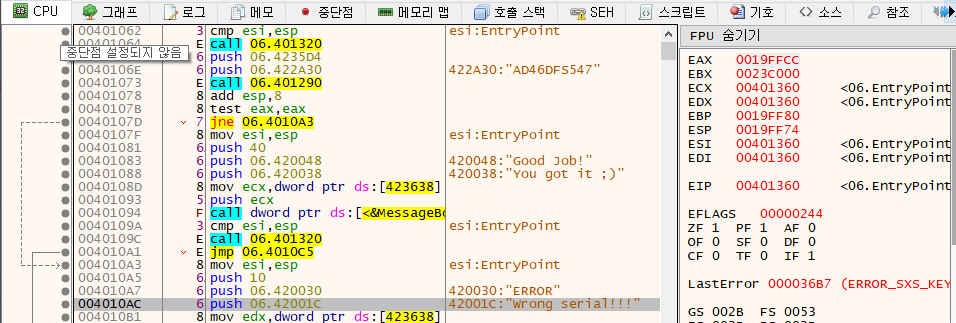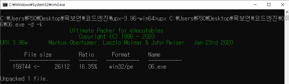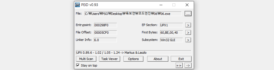 Season 1/워게임 [CodeEngn] Basic RCE L06 문제풀이 작성자 - S1ON 문제 정보 Unpack을 한 후 Serial을 찾으시오. 정답인증은 OEP + Serial Ex) 004000000PASSWORD 풀이 힌트 2-1. Packing 2-2. OEP 문제 풀이 더보기 3-1. PEiD를 통해 UPX로 패킹된 것을 확인하고, UPX 실행파일을 통해 언패킹을 수행한다. 3-2. 문자열 참조를 통해 "Wrong Serial!!!" 에러 메시지를 출력하는 주소를 확인한다. 3-3. 주소를 따라가보니 [00401073] 주소에서 호출된 함수 리턴 값으로 참/거짓이 판단되는 것을 확인할 수 있고, 함수 매개변수로 "AD46DFS547"가 전달된다. 3-4. 강력한 직감에 의지하여 "AD46DFS547" 문자열을 시리얼 키로 입력하니 참을 나타내는 문자열이 출력됐다. 3-5. OEP는 [00401360] 이고, PASSWORD는 "AD46DFS547" 이므로 정답은 "00401360AD46DFS547" 이다. 공유하기 게시글 관리 MSS 'Season 1 > 워게임' 카테고리의 다른 글 [Root-Me]/Web Server/File upload - Double extensions (0) 2022.01.14 [CodeEngn] Basic RCE L07 문제풀이 (0) 2021.12.31 [CodeEngn] Basic RCE L05 문제풀이 (0) 2021.12.30 [CodeEngn] Basic RCE L04 문제풀이 (0) 2021.12.29 [CodeEngn] Basic RCE L03 문제풀이 (0) 2021.12.29 Contents 당신이 좋아할만한 콘텐츠 [Root-Me]/Web Server/File upload - Double extensions 2022.01.14 [CodeEngn] Basic RCE L07 문제풀이 2021.12.31 [CodeEngn] Basic RCE L05 문제풀이 2021.12.30 [CodeEngn] Basic RCE L04 문제풀이 2021.12.29 댓글 0 + 이전 댓글 더보기