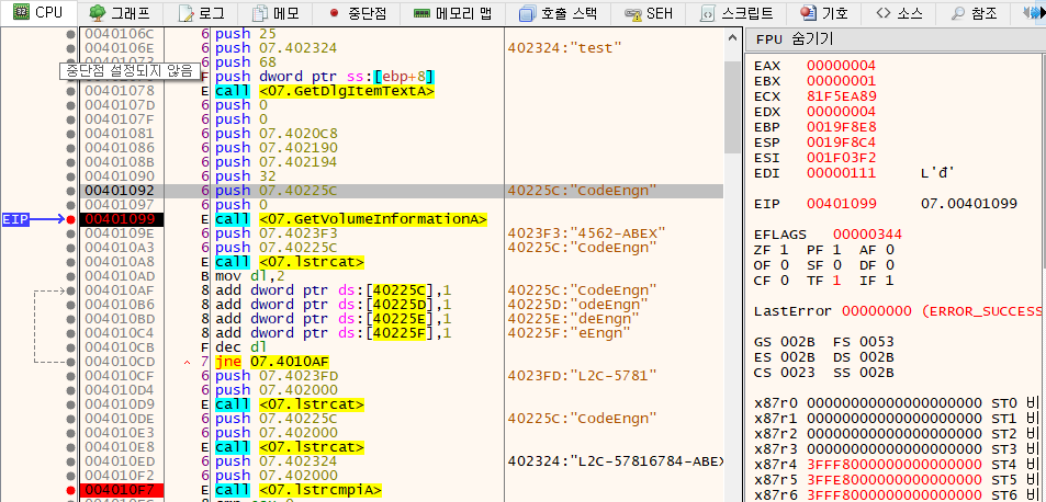 3-4. 해당 함수 호출 전 BP를 걸고 프로그램을 실행한다.