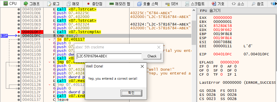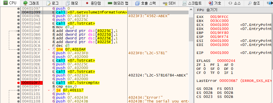 3-9. BP를 이용해 해당 함수가 실행되기 전 40225C의 주소에 있는 값을 CodeEngn으로 변경해서 실행한다. 그럼 strcat 함수를 통해 "CodeEngn"과 "4562-ABEX" 문자열이 합쳐지고, 이후 반복문을 통해 40225C에 저장된 네개의 문자열의 값에 +2를 한 문자열이 시리얼 키가 된다.