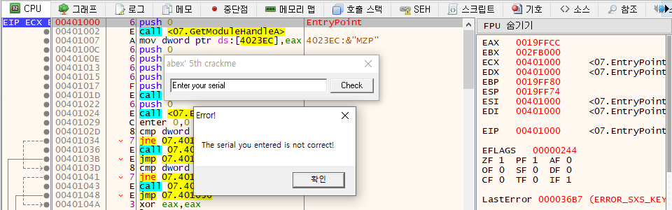 3-1. 잘못된 시리얼 키를 입력했을 때, 출력되는 에러 "The serial you entered is not correct!" 문자열을 확인한다.