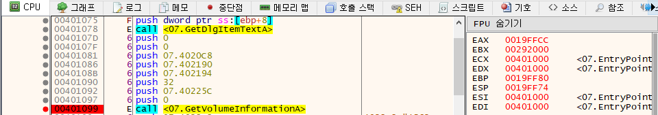 3-8. getvolumeinformationA 함수의 8개 매개변수 중, 2번째 인자 값에 드라이브의 이름이 들어가는데 마지막 매개변수가 코드 상 가장 위쪽에 위치하므로 아래에서 두번째인 40225C의 주소에 있는 값이 드라이브 명이라고 할 수 있다.
