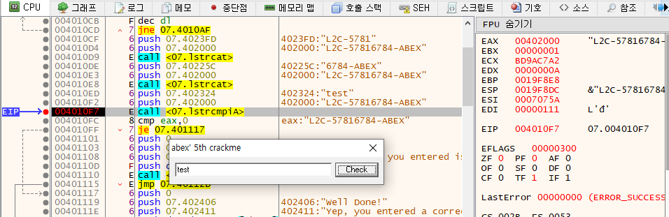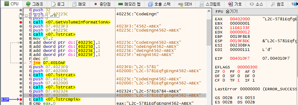 3-9. BP를 이용해 해당 함수가 실행되기 전 40225C의 주소에 있는 값을 CodeEngn으로 변경해서 실행한다. 그럼 strcat 함수를 통해 "CodeEngn"과 "4562-ABEX" 문자열이 합쳐지고, 이후 반복문을 통해 40225C에 저장된 네개의 문자열의 값에 +2를 한 문자열이 시리얼 키가 된다.