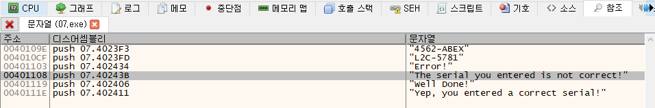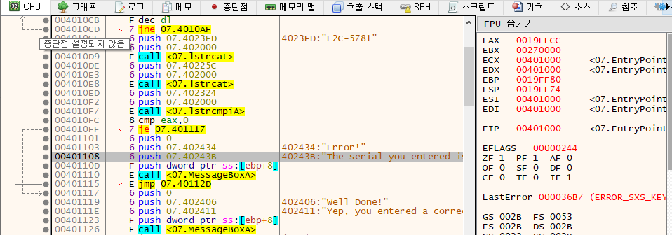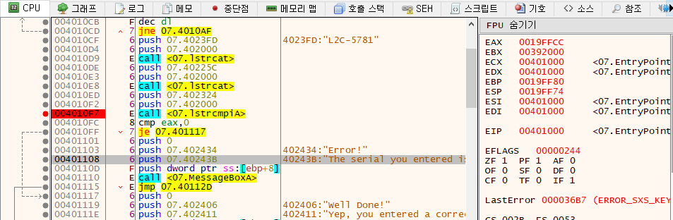 3-3. 위에서 확인한 주소를 따라가면 [call <07.lstrcmpiA>] 함수 리턴 값으로 참/거짓을 판별하는 것을 볼 수 있다.