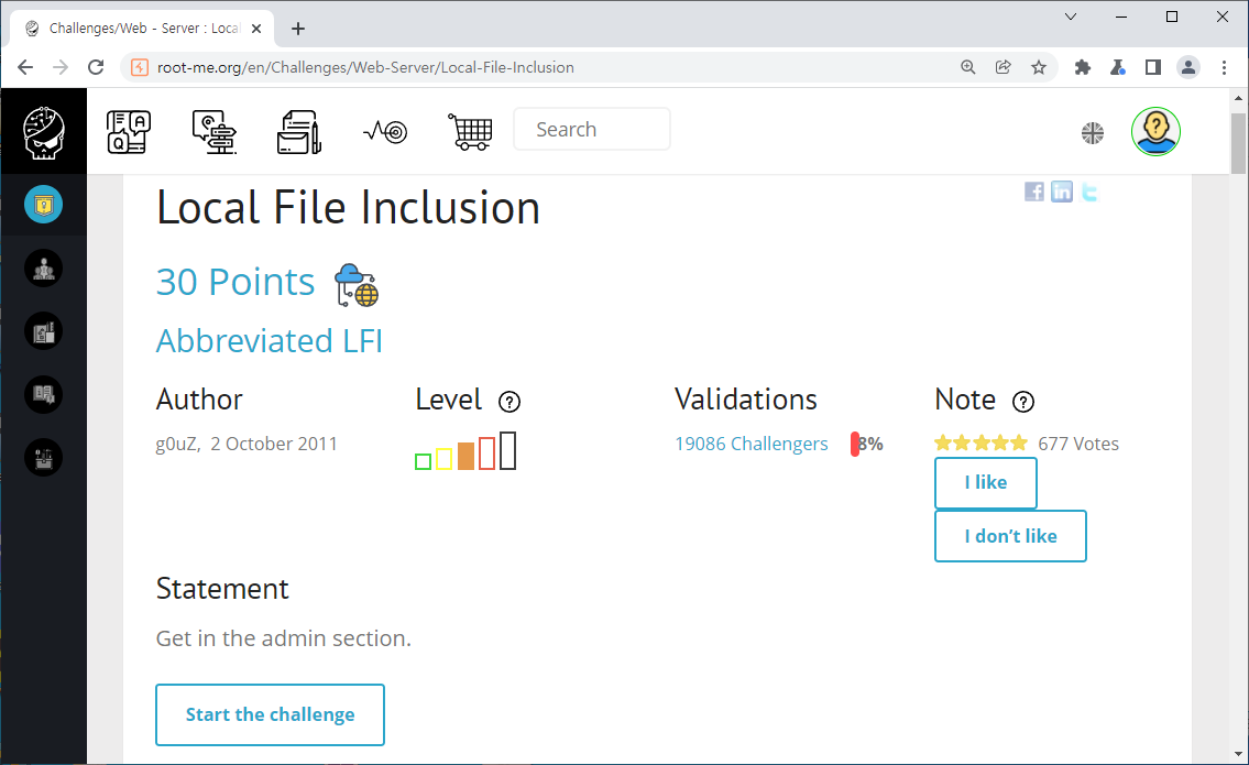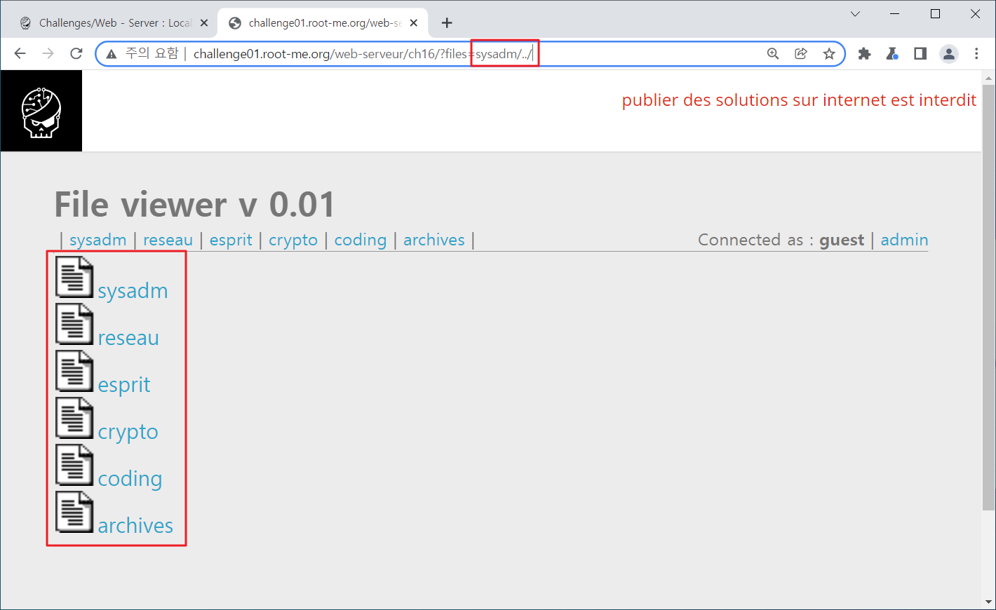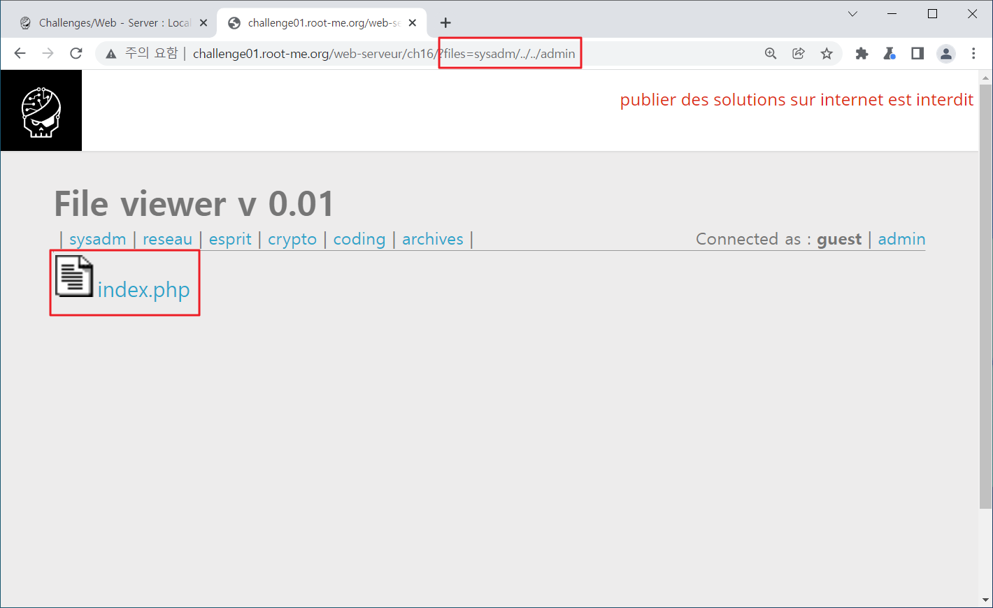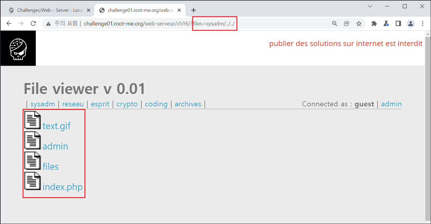 Season 1/워게임 [Root-Me]/Web Server/Local File Inclusion 작성자 - 한수임 문제풀이 바로 시작해보겠습니다. 1. 문제 Local File Inclusion(LFI) 주제네요. 2. 문제풀이 문제 접근 시 카테고리들이 존재하며, 아래 파일들이 존재하네요 connected as : guest | admin을 보아 admin을 접근해야 할 것만 같습니다. 힌트 또한 어드민 영역에 접근하라고 하네요. admin에 접근하니 ID/PW를 요구하네요. 여기에 접근할 수 있으면 문제가 해결될 것 같습니다. 먼저 LFI 답게 파일 경로 위에 무엇이 더 있는지 확인해 보겠습니다. 해당 파일 상위경로로 이동하니 카테고리들이 존재하였습니다. 한번 더 경로를 높혀보겠습니다. admin 파일이 존재하네요.... 파일에 접근해보겠습니다. admin 파일에 접근하니 index.php 파일이 존재하며 index.php 파일에 접근해보겠습니다. index.php 파일을 클릭하니 users에 admin으로 뭔가 관리자 ID/PW가 적혀있는 것만 같습니다. 해당 정보를 통해 로그인 시도를 해보겠습니다. 사용된 패스워드를 검증해보라는 것 같습니다. 해당 패스워드를 검증해보니.. 파랑새가 나오게 되었습니다. 오늘 문제풀이 끄읏~ 공유하기 게시글 관리 MSS 'Season 1 > 워게임' 카테고리의 다른 글 [Root-Me]/Web Server/File upload - Null byte (0) 2022.01.20 [Root-Me]/Web Server/File upload - MIME type (0) 2022.01.18 [Root-Me]/Web Server/File upload - Double extensions (0) 2022.01.14 [CodeEngn] Basic RCE L07 문제풀이 (0) 2021.12.31 [CodeEngn] Basic RCE L06 문제풀이 (0) 2021.12.30 Contents 당신이 좋아할만한 콘텐츠 [Root-Me]/Web Server/File upload - Null byte 2022.01.20 [Root-Me]/Web Server/File upload - MIME type 2022.01.18 [Root-Me]/Web Server/File upload - Double extensions 2022.01.14 [CodeEngn] Basic RCE L07 문제풀이 2021.12.31 댓글 0 + 이전 댓글 더보기